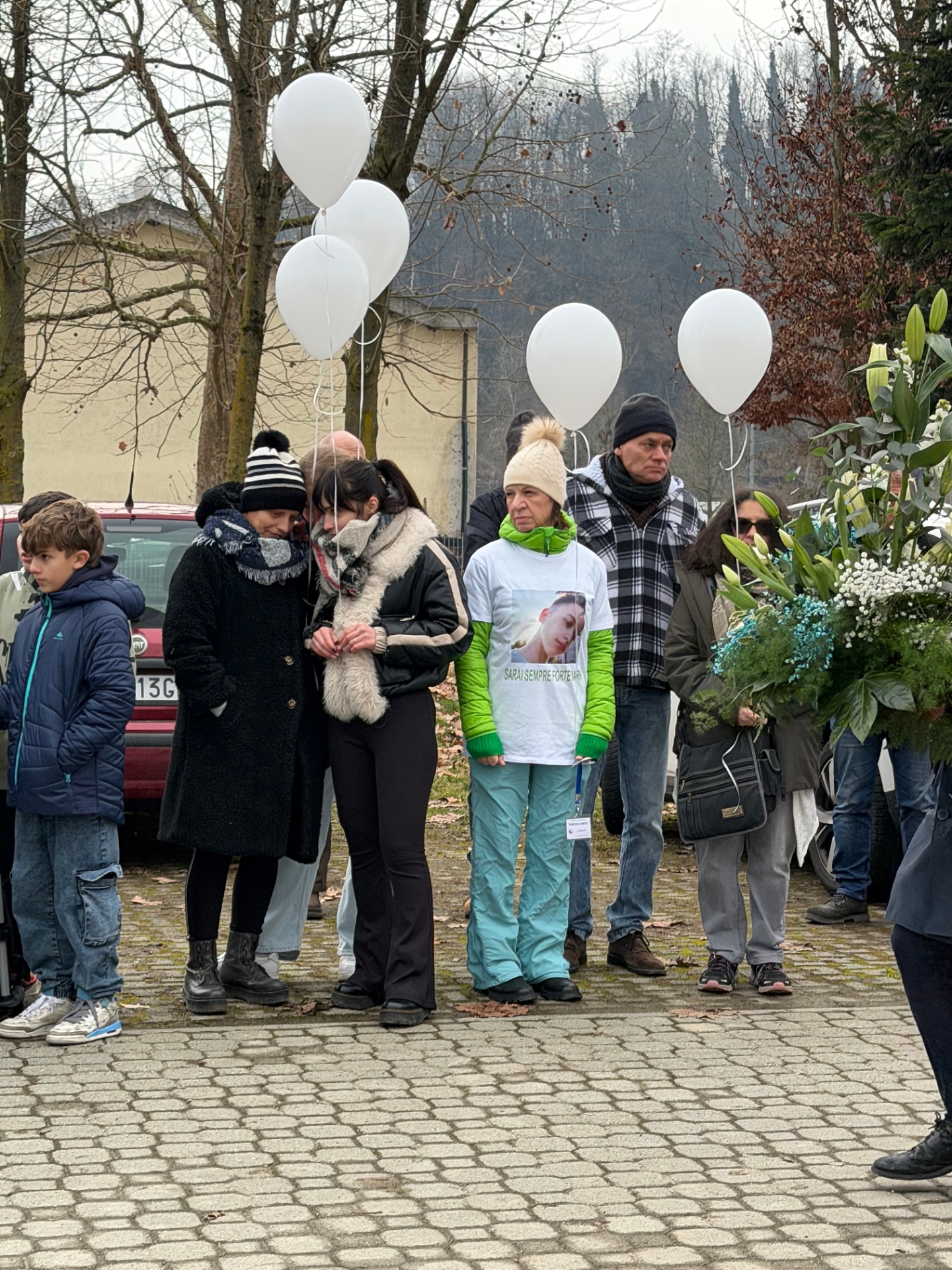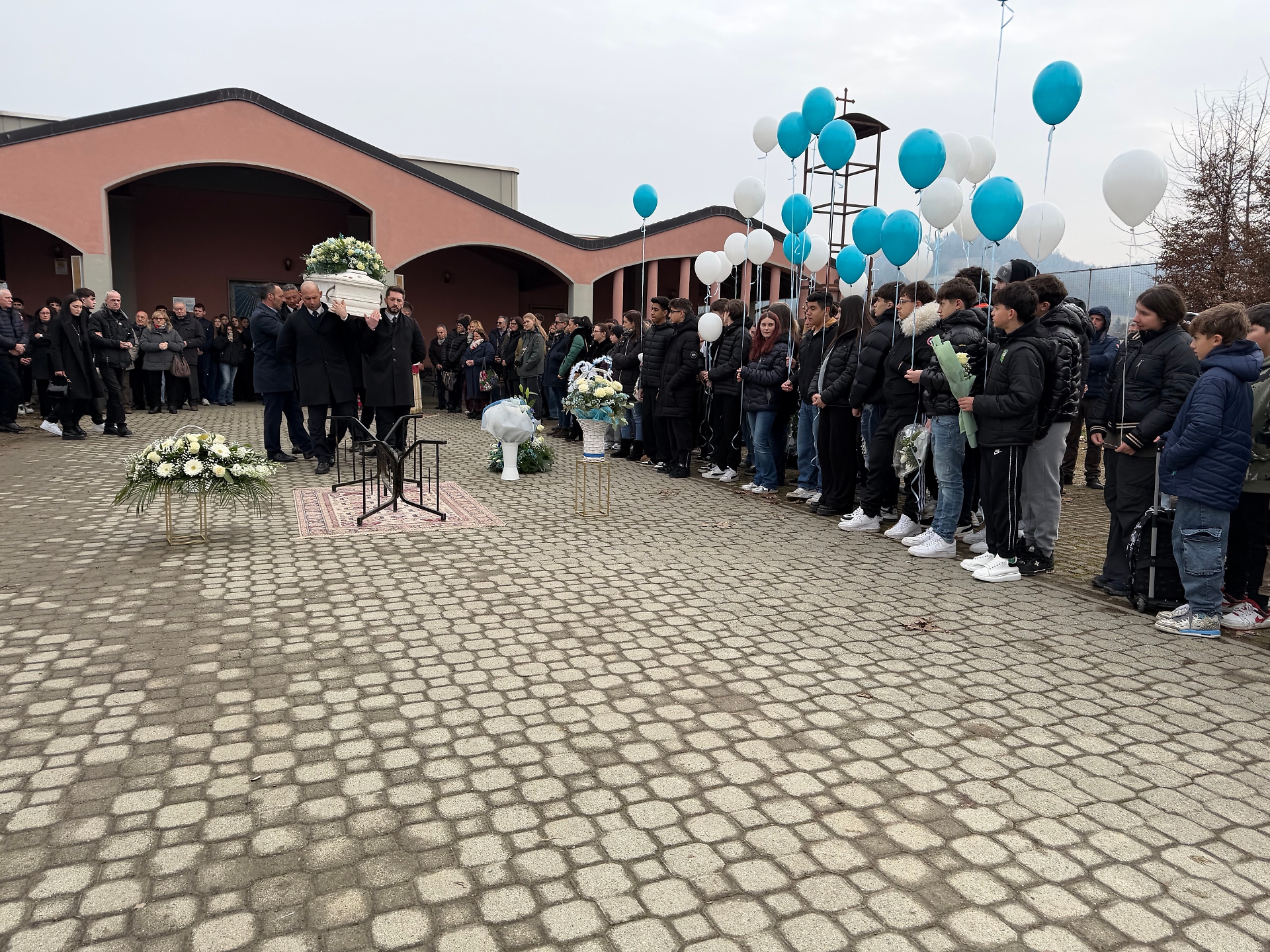 Fuori, in mezzo alla gente, c’erano i compagni. Ragazzi e ragazze con i palloncini bianchi e azzurri, messi lì non per fare scena, ma perché a quell’età si cerca un simbolo per non esplodere. Per trattenere il fiato e trasformarlo in qualcosa che salga in alto, almeno per un momento.