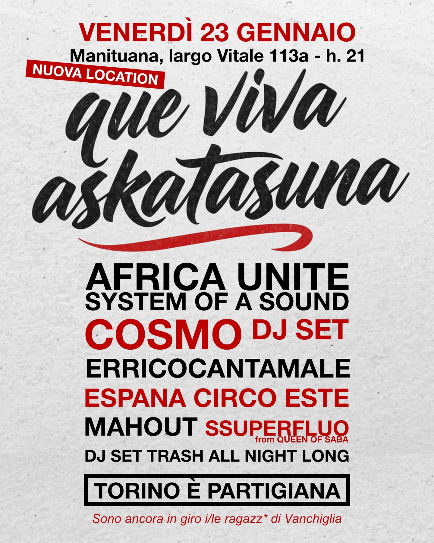 La festa di Askatasuna, alla fine, si è fatta. Non dentro Palazzo Nuovo, non tra le aule universitarie che per decenni hanno ospitato assemblee, concerti, iniziative studentesche e notti fuori programma, ma al Laboratorio culturale autogestito Manituana, in largo Vitale. Uno spostamento forzato, deciso dopo il no secco dell’Università di Torino, che ha chiuso la sede umanistica per “motivi di sicurezza”, ma che ha finito per caricare l’evento di un significato politico e simbolico ancora più forte.