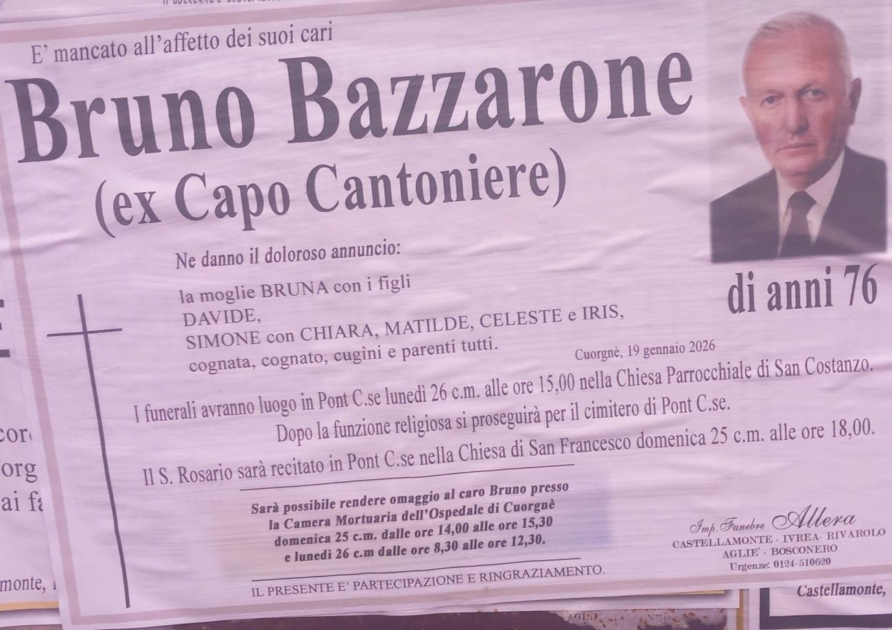 I funerali di Bruno Bazzarone si terranno oggi, lunedì 26 gennaio alle 15,nella Chiesa parrocchiale di San Costanzo a Pont Canavese. Il feretro partirà dall’ospedale di Cuorgnè alle 14.30. Dopo la funzione, la tumulazione avverrà nel cimitero di Pont.