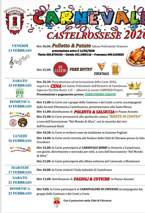 ° Venerdì 13 febbraio: cena a base di polletto e patate al Salone Polivalente dell’Oratorio, seguita dalla “Carnival Night Music” con DJ Alexio, tra musica, cocktail e ingresso libero.