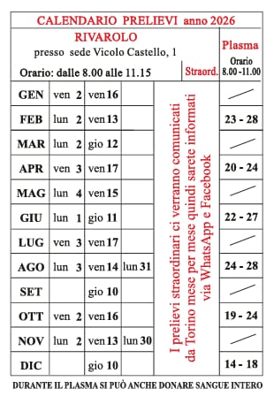 La FIDAS Rivarolo Canavese ricorda che chiunque sia in buona salute può donare il sangue, prenotandosi nelle date previste dal calendario, anche online all’indirizzo www.adsp.me/610, dal momento che la gestione delle sacche avviene in base alle prenotazioni e alla disponibilità dell’équipe medica.
