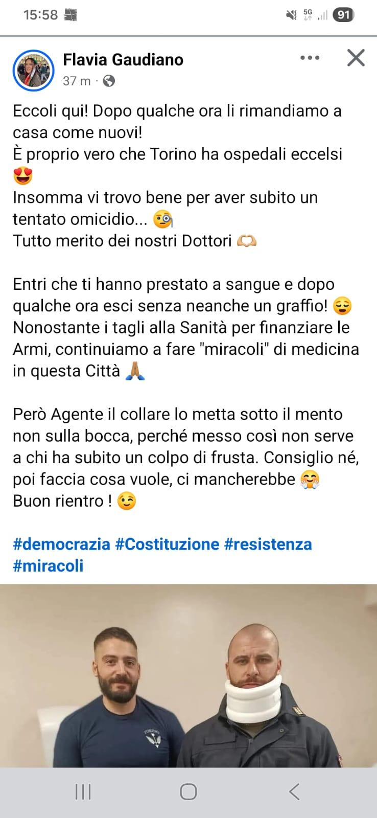A sollevare pubblicamente il caso è stato Andrea Cerutti, consigliere regionale della Lega, che ha puntato il dito contro alcune dichiarazioni diffuse online da Flavia Gaudiano, consigliera comunale di Rivalta e candidata a sostegno del sindaco di centrosinistra Sergio Muro. Secondo Cerutti, i contenuti pubblicati avrebbero ironizzato sulle condizioni dei due agenti rimasti feriti durante gli scontri di Torino, arrivando a commentare la loro dimissione dall’ospedale attraverso immagini e messaggi giudicati inaccettabili.