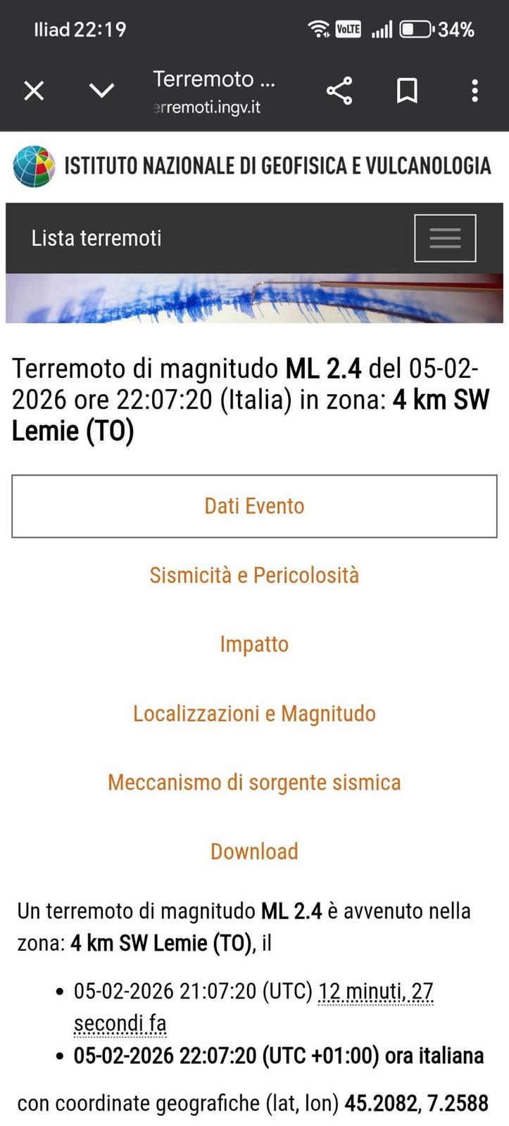 Il sisma, secondo i dati ufficiali dell’Istituto nazionale di geofisica e vulcanologia (Ingv), ha avuto epicentro a Lemie, in alta Val di Susa, con una magnitudo ML 2.4 ed è stato registrato nella serata di mercoledì 5 febbraio 2026. Una magnitudo contenuta, ma sufficiente a essere percepita in modo netto in un’area piuttosto ampia, complice la profondità e le caratteristiche geologiche della zona.