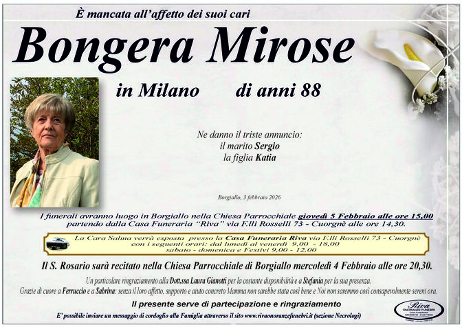 Borgiallo saluta Mirose Bongera. Aveva 88 anni e se n’è andata come aveva vissuto: in silenzio, senza chiedere spazio, lasciando però un vuoto che il paese ha avvertito subito, con quella forma di dolore composta che accompagna l’addio alle persone autentiche.