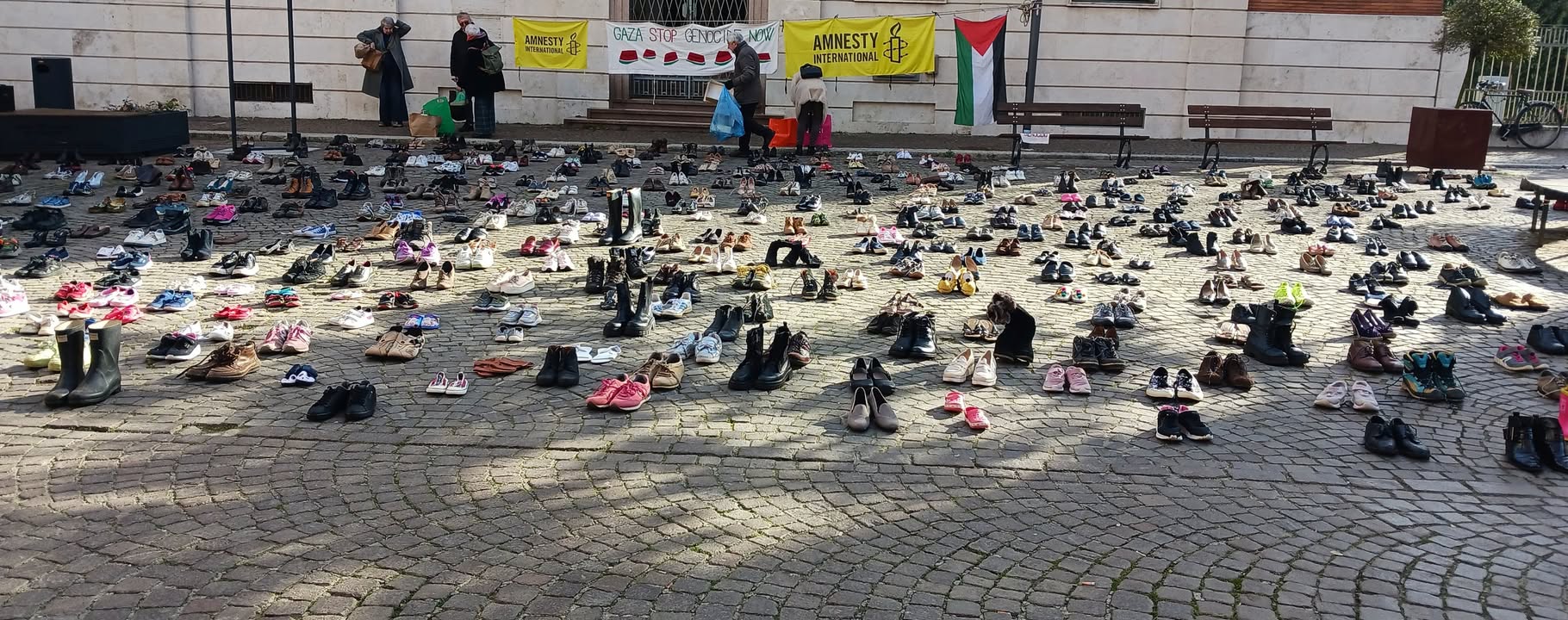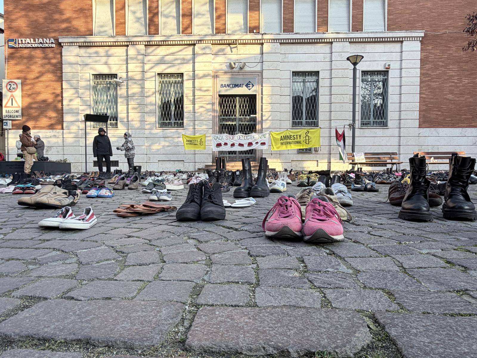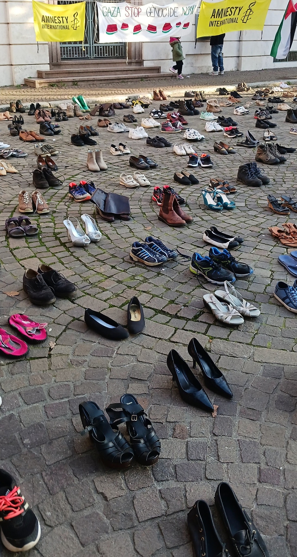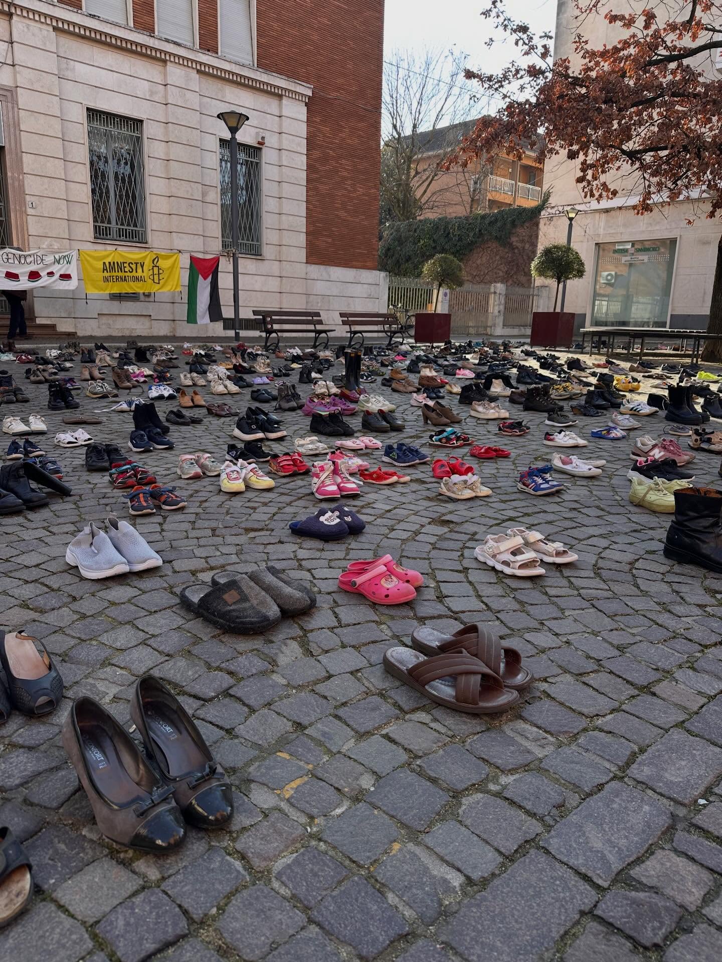 L’iniziativa, intitolata “Scarpe per Gaza”, è stata promossa dalla sezione locale di Amnesty International insieme a comitati spontanei del territorio. Un flashmob pacifico, senza slogan urlati né bandiere, costruito sulla forza dei simboli. Ogni paio di scarpe rappresentava una persona che non potrà più camminare, una vita spezzata dalla violenza dei conflitti armati. Allo stesso tempo, quelle scarpe raccontavano anche il cammino di chi, ancora oggi, continua a chiedere giustizia, pace e tutela dei civili.