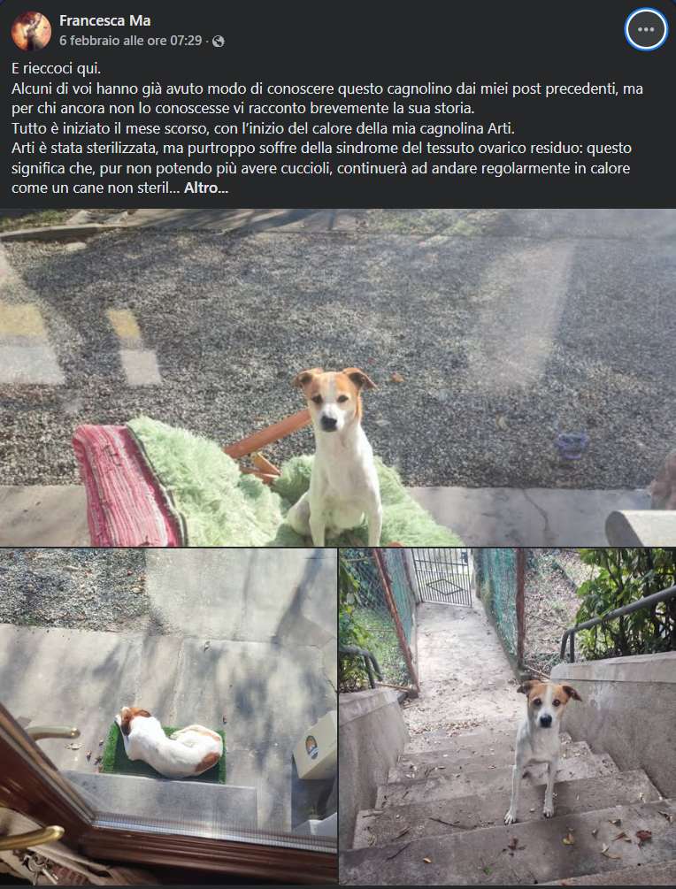 Tutto comincia il mese scorso, con l’inizio del calore della sua cagnolina Arti. Una condizione particolare, come spiega lei stessa: «Arti è stata sterilizzata, ma purtroppo soffre della sindrome del tessuto ovarico residuo: questo significa che, pur non potendo più avere cuccioli, continuerà ad andare regolarmente in calore come un cane non sterilizzato». È proprio in quei giorni che, come spesso accade, alcuni cani maschi iniziano a girare nella zona. Ed è così che compare lui.