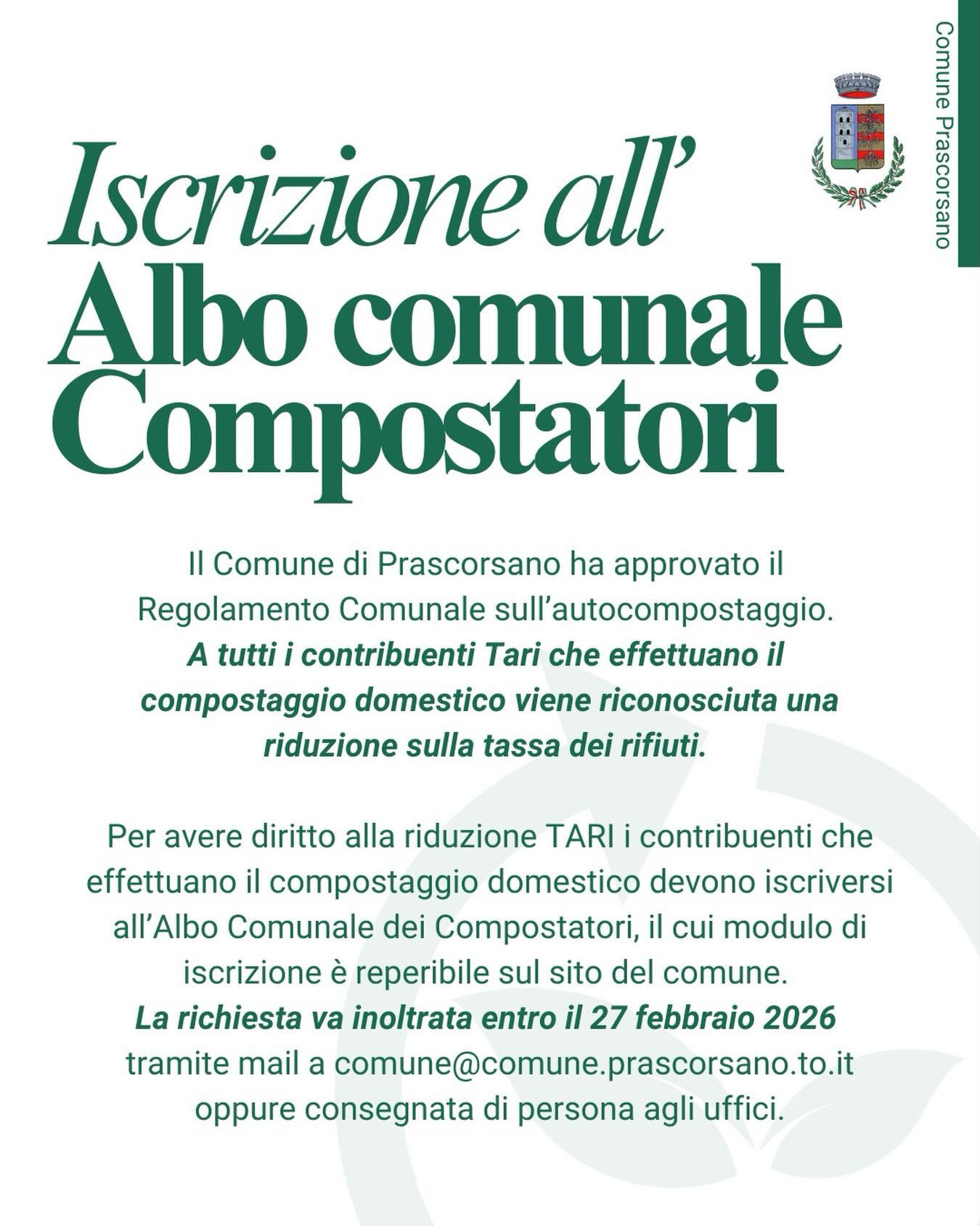 Il modulo di iscrizione è disponibile sul sito istituzionale del Comune di Prascorsano, nella homepage o nella sezione dedicata alla trasparenza nella gestione dei rifiuti, ed è reperibile anche presso gli uffici comunali durante i consueti orari di apertura. La domanda deve essere presentata entro il 27 febbraio 2026, inviandola via mail all’indirizzo comune@comune.prascorsano.to.it oppure consegnandola direttamente agli uffici.