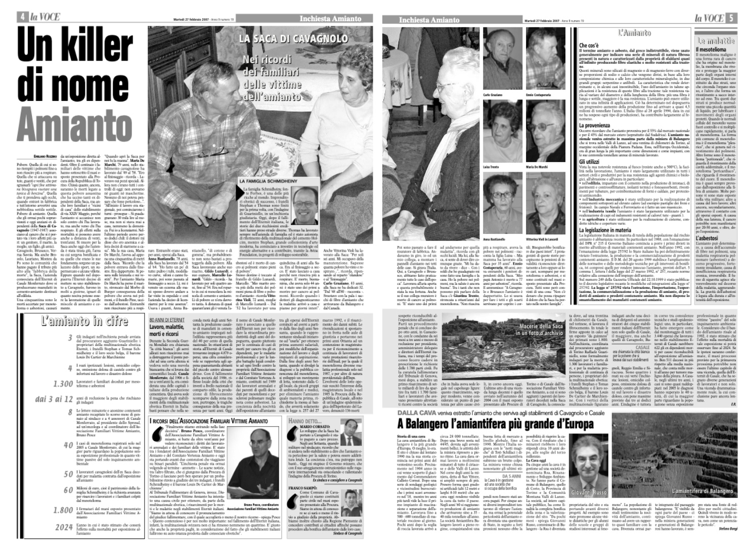Il procedimento nasce dall’inchiesta della Procura di Torino per le morti causate dall’esposizione all’amianto negli stabilimenti italiani della multinazionale Eternit. La fibra killer ha causato migliaia di morti: operai, residenti, famigliari. Queste vittime non sono numeri, sono volti, storie, famiglie distrutte.