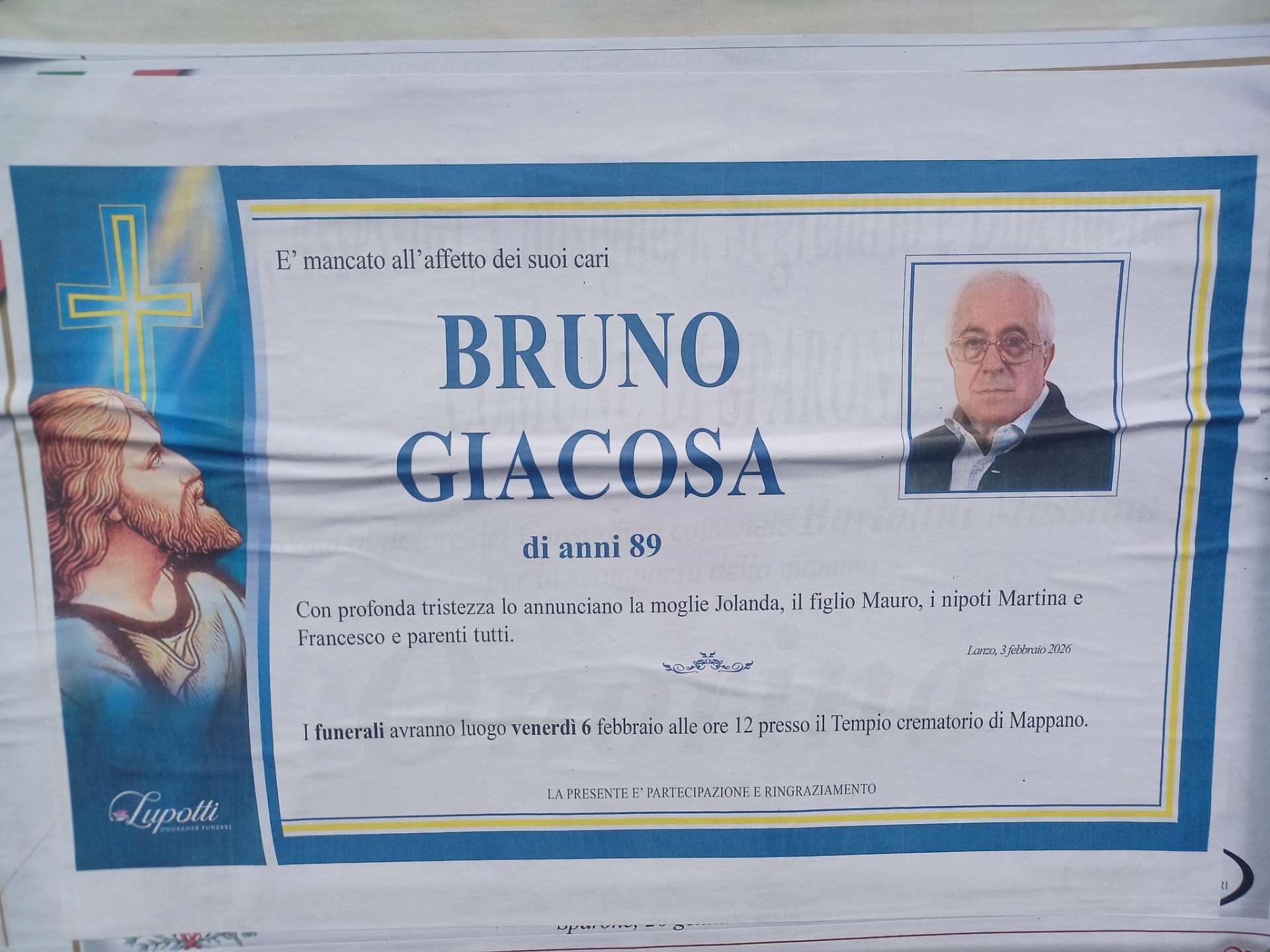 Nel manifesto funebre, accanto al suo nome, compaiono quelli della moglie Jolanda, del figlio Mauro, dei nipoti Martina e Francesco, e dei parenti tutti. Una famiglia che oggi raccoglie l’abbraccio di un paese intero.