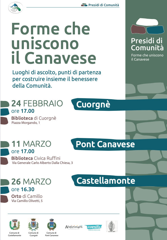 Le date intanto sono fissate. Si parte il 24 febbraio alle 17 alla Biblioteca di Cuorgnè, si prosegue l’11 marzo alle 17 alla Biblioteca Civica Ruffini di Pont Canavese, si chiude il 26 marzo alle 16.30 all’Orto di Camillo di Castellamonte. Tre appuntamenti pubblici per conoscere operatori e attività.