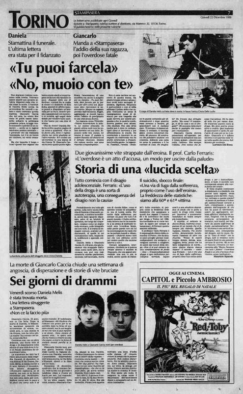 Venerdì 16 dicembre, quando Daniela muore, Giancarlo sparisce e ricompare a casa della madre il lunedì sera. Qui riceve dalla donna le parole d’addio dell’amata e le porta alla sede de La Stampa Sera. Il giorno dopo incontra di mattina suor Angela (una volontaria del Cottolengo che l’aveva preso a cuore) che lo accompagna a vedere il cadavere della fidanzata all’obitorio e poi, nel pomeriggio, si reca in comunità dove si offrono di condurlo all’ospedale per prendere il metadone. Il ragazzo rifiuta ma riferisce che il giorno successivo, il 21, inizierà da loro l’ennesimo percorso di terapia.