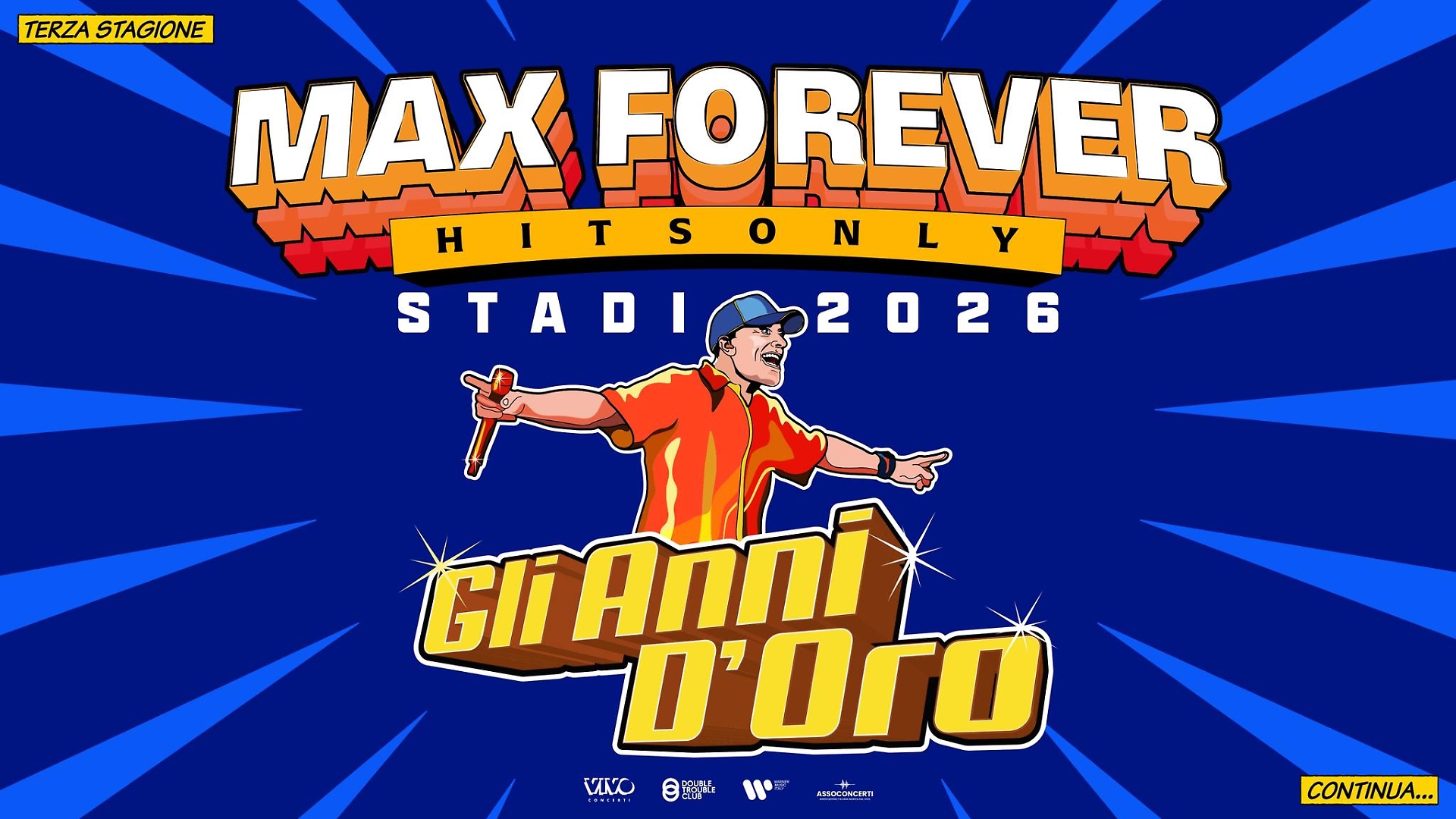 Poi, tra giugno e luglio, il ritorno negli stadi con “Max Forever gli anni d’oro - stadi 2026”: 15 date che porteranno Max Pezzali a Lignano Sabbiadoro (7 giugno, Stadio Teghil), Torino (13 e 14 giugno, Allianz Stadium), Napoli (19 giugno, Stadio Maradona), Roma (23 e 24 giugno, Stadio Olimpico), Bologna (27 e 28 giugno, Stadio Dall’Ara), Messina (1 e 2 luglio, Stadio F. Scoglio), Bari (5 luglio, Stadio San Nicola), Padova (8 e 9 luglio, Stadio Euganeo) e Milano (11 e 12 luglio, Stadio San Siro).