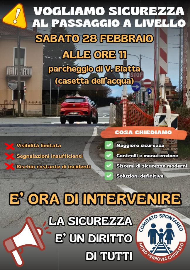 Sabato 28 febbraio alle ore 11 il comitato Nord Ferrovia Chivasso torna in piazza. L’appuntamento è nel parcheggio di via Blatta, accanto alla casetta dell’acqua. L’obiettivo è chiaro: chiedere la messa in sicurezza del passaggio a livello sulla linea Chivasso-Ivrea. Nessun giro di parole, nessuna formula di circostanza. Solo una domanda che pesa come una sbarra abbassata: quanto si può andare avanti così?