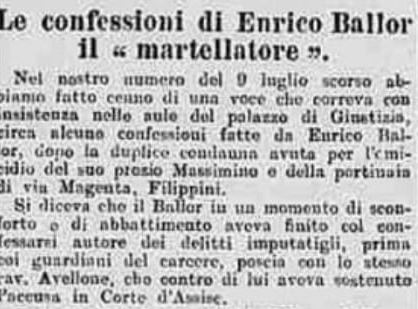 Arriva l’8 luglio e Ballor decide che ne ha abbastanza e confessa. Racconta nei minimi particolari dell’omicidio dello zio e della portinaia ma non si ferma li. Si, è stato lui a uccidere anche le due donne al circolo Carpissi. Riferisce che le ha fatte fuori non con un martello ma con una chiave inglese.