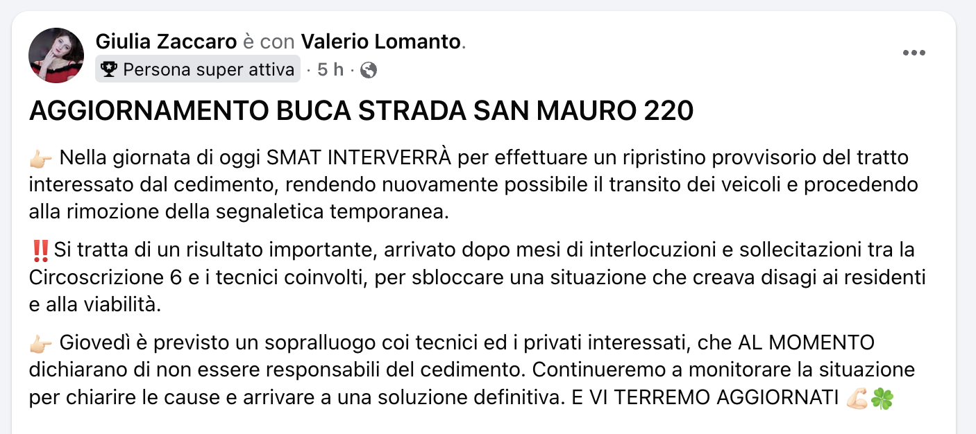 Secondo quanto comunicato dalla consigliera della Circoscrizione 6, Giulia Zaccaro, l’intervento è il risultato di mesi di sollecitazioni e interlocuzioni tra la circoscrizione e i tecnici coinvolti, per sbloccare una situazione che stava creando disagi concreti alla viabilità e ai residenti.