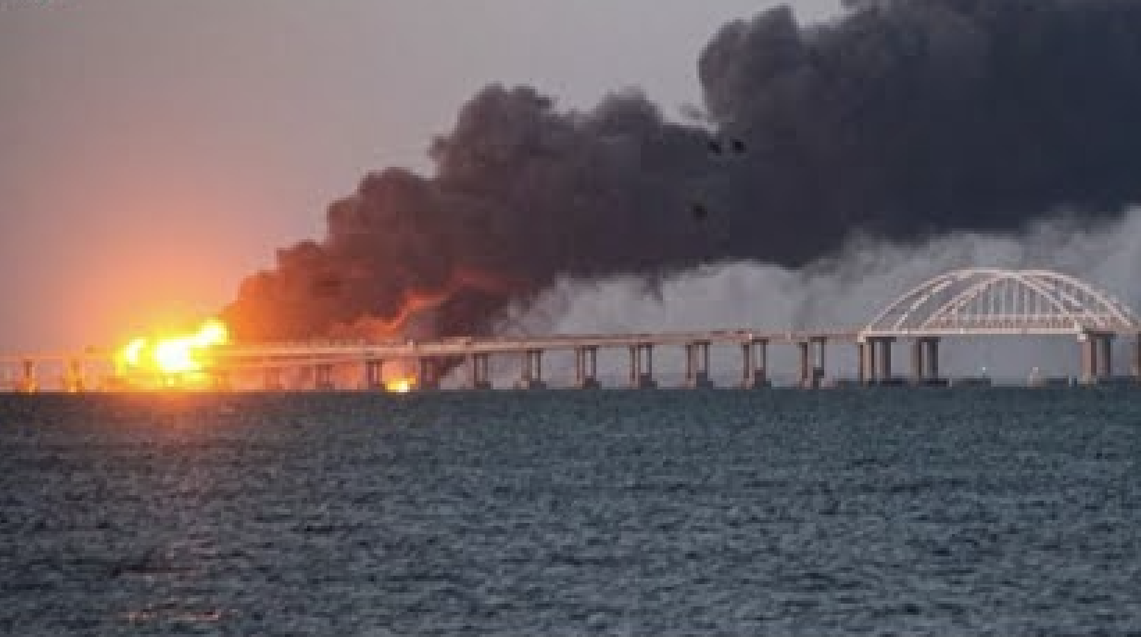 Il Ponte di Crimea avvolto dalle fiamme dopo l’esplosione dell’8 ottobre 2022. L’attacco ha danneggiato gravemente l’infrastruttura strategica che collega la Russia alla penisola annessa nel 2014, diventando uno degli episodi più simbolici della guerra tra Mosca e Kiev.