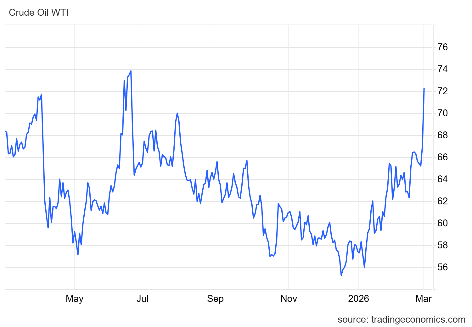 Andamento del petrolio WTI (2025-2026). Anche il benchmark statunitense registra un forte rialzo all’inizio del 2026, segno delle tensioni che attraversano l’intero mercato energetico mondiale mentre le rotte del petrolio nel Golfo Persico diventano sempre più instabili.