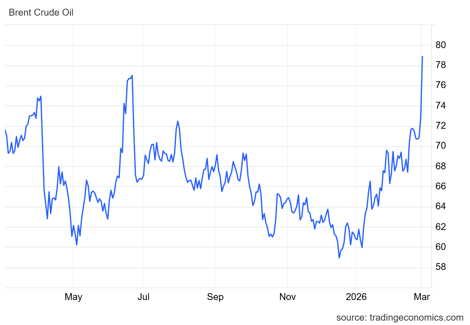 Andamento del petrolio Brent (2025-2026). Il benchmark europeo registra una brusca impennata all’inizio del 2026, superando i 78 dollari al barile, mentre le tensioni geopolitiche nel Golfo Persico e il rischio di interruzioni nello Stretto di Hormuz alimentano la volatilità dei mercati energetici globali.