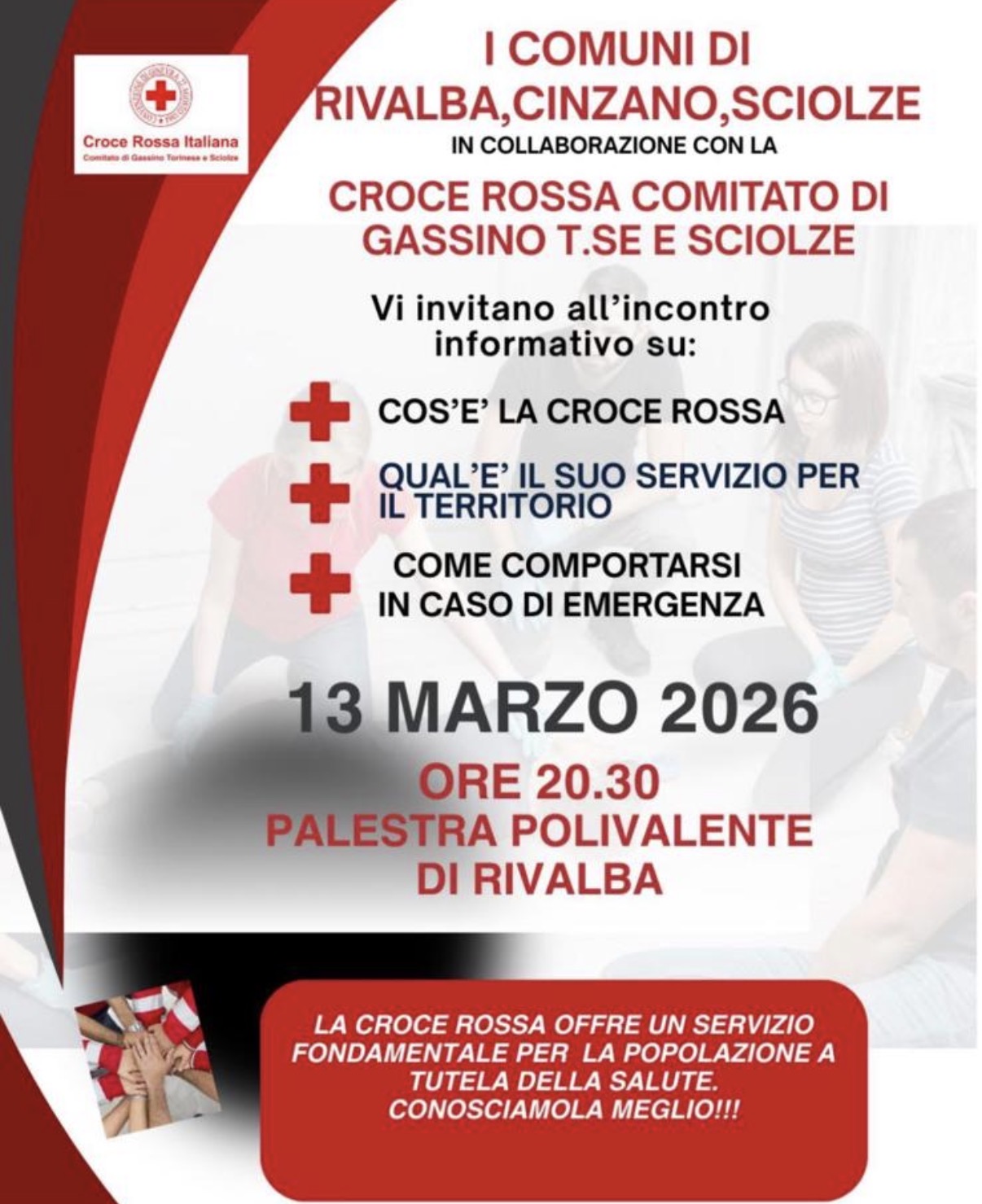 Una serata dedicata alla conoscenza del ruolo della Croce Rossa e dei servizi fondamentali che offre alla comunità. È questo l’obiettivo dell’incontro informativo che si terrà venerdì 13 marzo 2026 alle ore 20.30 presso la palestra polivalente di Rivalba.