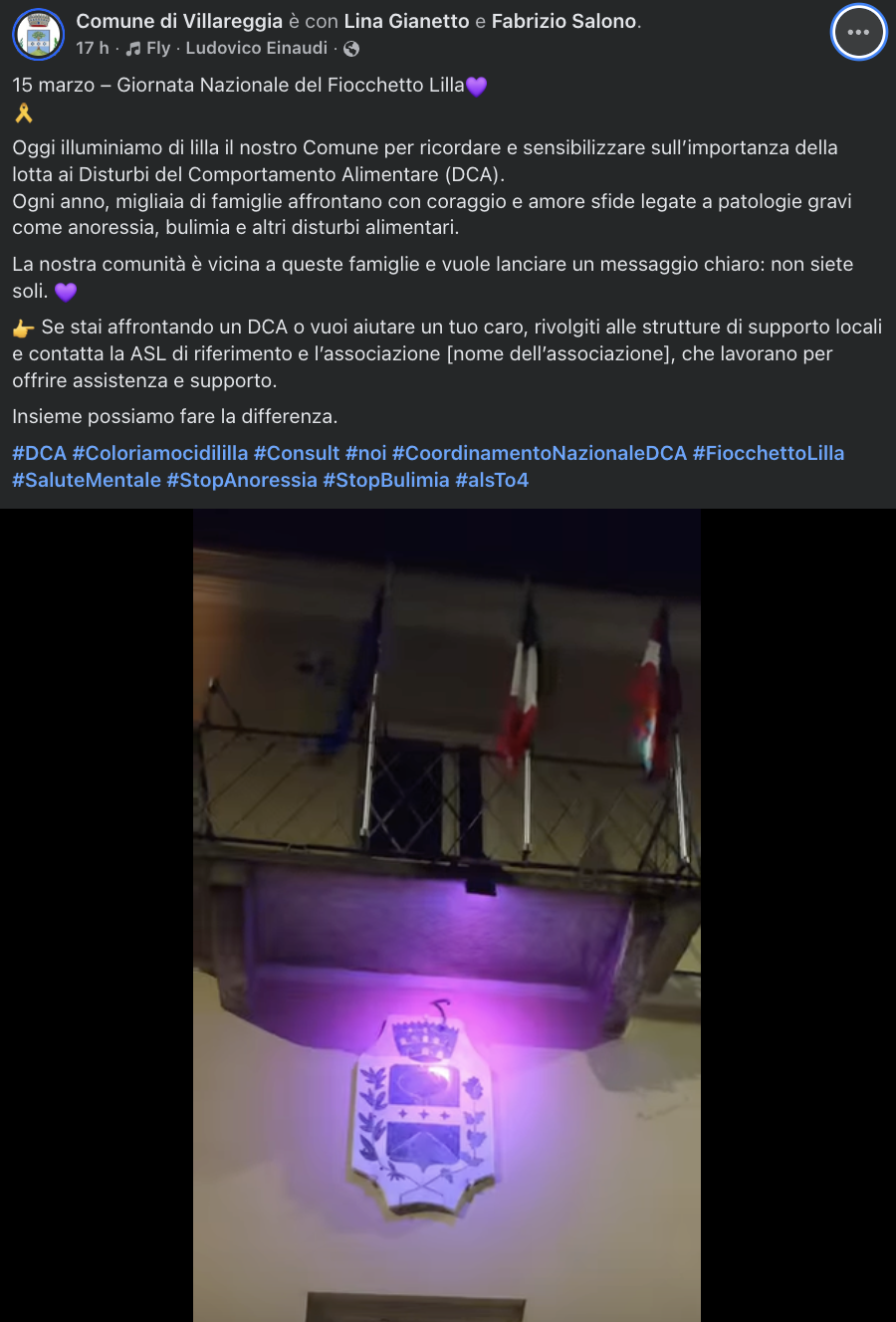 Un colore per ricordare, ma soprattutto per sensibilizzare. Anche Villareggia ha aderito alla Giornata Nazionale del Fiocchetto Lilla, celebrata il 15 marzo, un momento dedicato alla lotta contro i Disturbi del Comportamento Alimentare (DCA), patologie sempre più diffuse che colpiscono soprattutto giovani e adolescenti ma che possono riguardare persone di tutte le età.