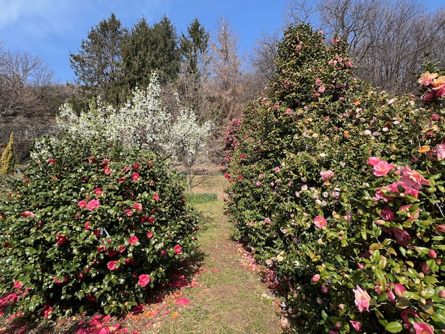 Le protagoniste sono naturalmente le camelie: dalla raffinata Camellia japonica “Debutante”, alle varietà più intense come la Camellia Higo, fino alle delicate sasanqua autunnali e a cultivar rare e profumate, difficilmente visibili nei giardini italiani. Un patrimonio botanico che unisce valore estetico e ricerca.