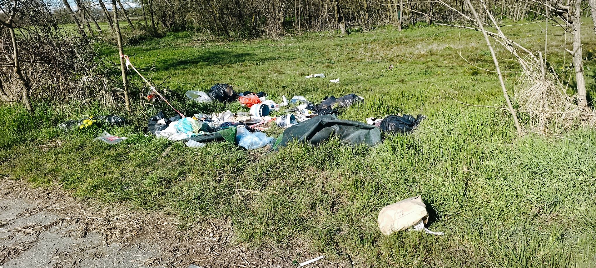 Lo scatto parla chiaro: sull’erba si accumula un miscuglio di rifiuti di ogni tipo, segno di uno o più episodi di abbandono. Si notano numerosi sacchi della spazzatura, alcuni già lacerati, dai quali fuoriescono materiali vari, tra cui sacchetti di plastica colorati, imballaggi e resti di oggetti di uso quotidiano. Non mancano scarti riconducibili a piccoli lavori domestici, come un secchio in plastica tipico di vernici o materiali da edilizia. Tra l’erba compaiono anche indumenti abbandonati, pezzi di tessuto e quello che sembra essere un telo scuro, ormai in parte coperto dal terreno. Sparsi qua e là si vedono lattine, cartacce e contenitori per alimenti.