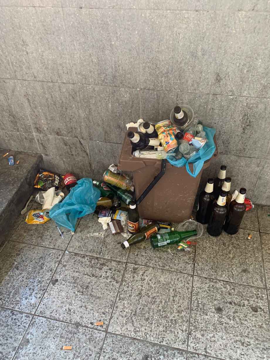 Ma il problema, racconta chi vive lì, è più ampio. Riguarda anche la piazzetta esterna, soprattutto nei pressi delle scale che portano alle abitazioni. «Ogni giorno troviamo bottiglie di vetro, spesso rotte. Cocci ovunque. Per uscire di casa dobbiamo fare lo slalom». Non è un modo di dire: le immagini mostrano vetri sparsi, rifiuti abbandonati, sacchetti pieni lasciati accanto ai cestini già stracolmi.