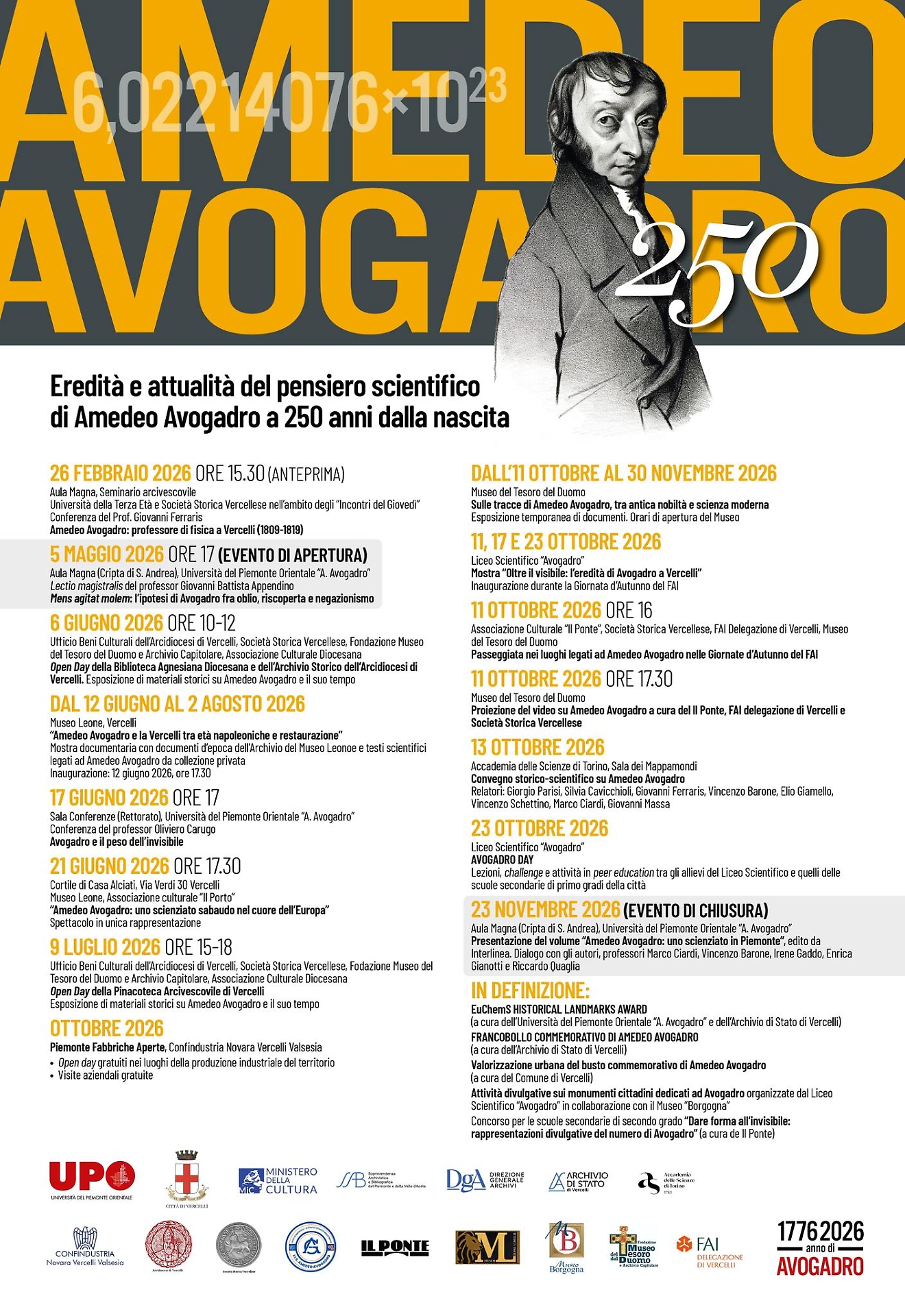 Un nome che ha cambiato per sempre il modo di comprendere la materia e le sue leggi fondamentali. A 250 anni dalla nascita di Amedeo Avogadro, Vercelli e l’Università del Piemonte Orientale scelgono di rendergli omaggio con un programma articolato che va ben oltre la semplice celebrazione, trasformandosi in un percorso culturale diffuso e partecipato.