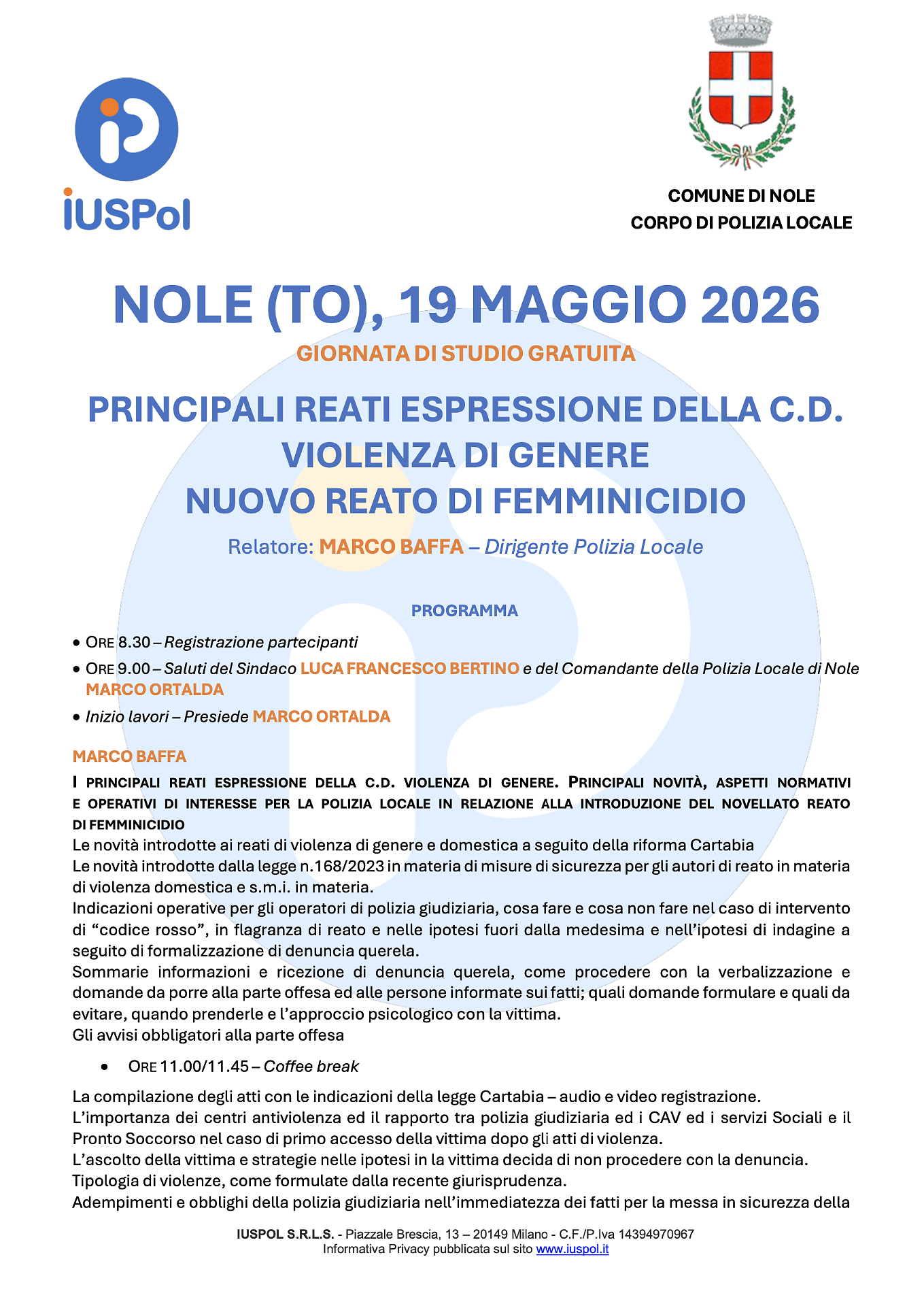 Il 19 maggio, al Nole Forum di via Devesi 14, il Corpo di Polizia Locale del Comune di Nole, guidato dal comandante Marco Ortalda - che presiederà i lavori - organizza un incontro formativo dedicato agli operatori. Un programma fitto, tecnico, dettagliato, con tanto di test finale e attestato valido ai fini della progressione in carriera. Tutto ineccepibile, sulla carta. Con tanto di saluti del sindaco di Nole Luca Bertino che daranno il via alla giornata di studio.