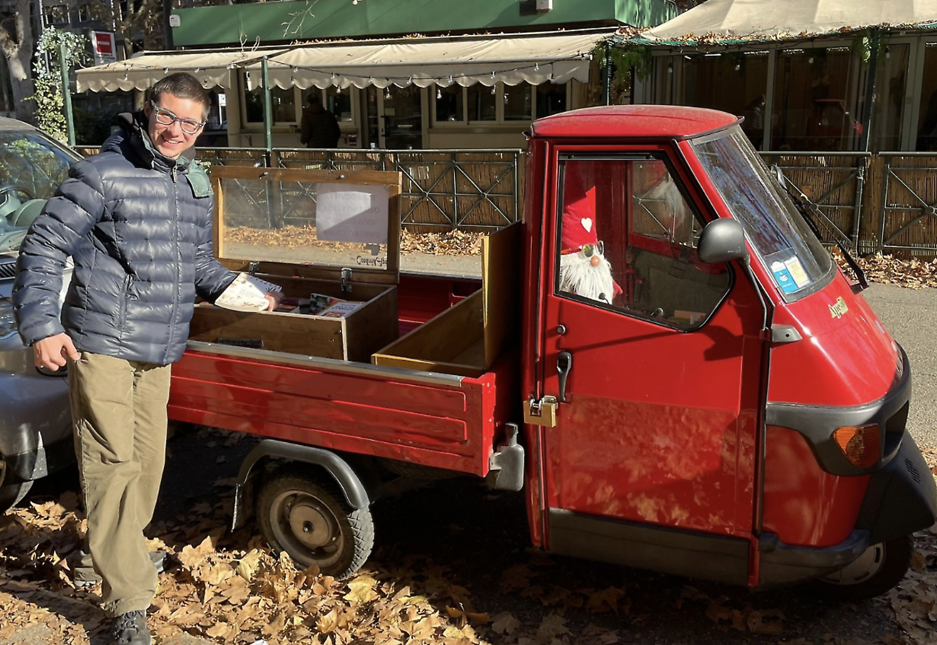 Nel caso di Leonardo Figello, la solidarietà ha preso la forma di un oggetto ben visibile nello spazio urbano. Il suo progetto si chiama “CondividApe” ed è, letteralmente, una Apecar trasformata in punto solidale mobile. Ogni giorno il mezzo viene parcheggiato davanti al liceo classico Cavour, in corso Tassoni, diventando un piccolo presidio di condivisione. Sul retro, due casse di legno: una per i libri, secondo la logica del bookcrossing, e una per beni di prima necessità – cibo, vestiti, oggetti utili. Il principio è semplice e immediato: chi ha bisogno può prendere, chi può lascia qualcosa.