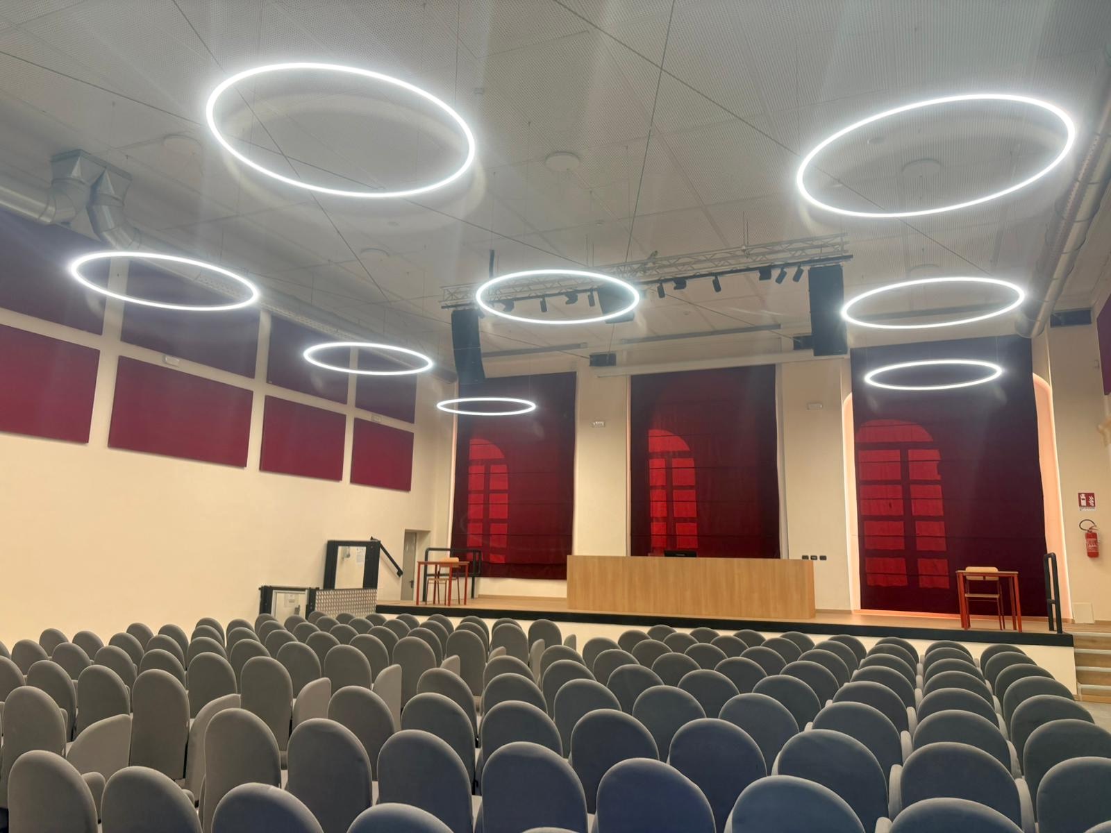 Particolare attenzione è stata dedicata all’auditorium, completamente riqualificato con nuovi impianti elettrici e di illuminazione, sistemi di riscaldamento e ricambio d’aria e un generale rinnovamento degli spazi. L’ambiente è oggi pienamente utilizzabile, anche se restano alcuni interventi di dettaglio ancora in fase di completamento, tra cui il ripristino dell’ascensore del foyer e alcune finiture interne.