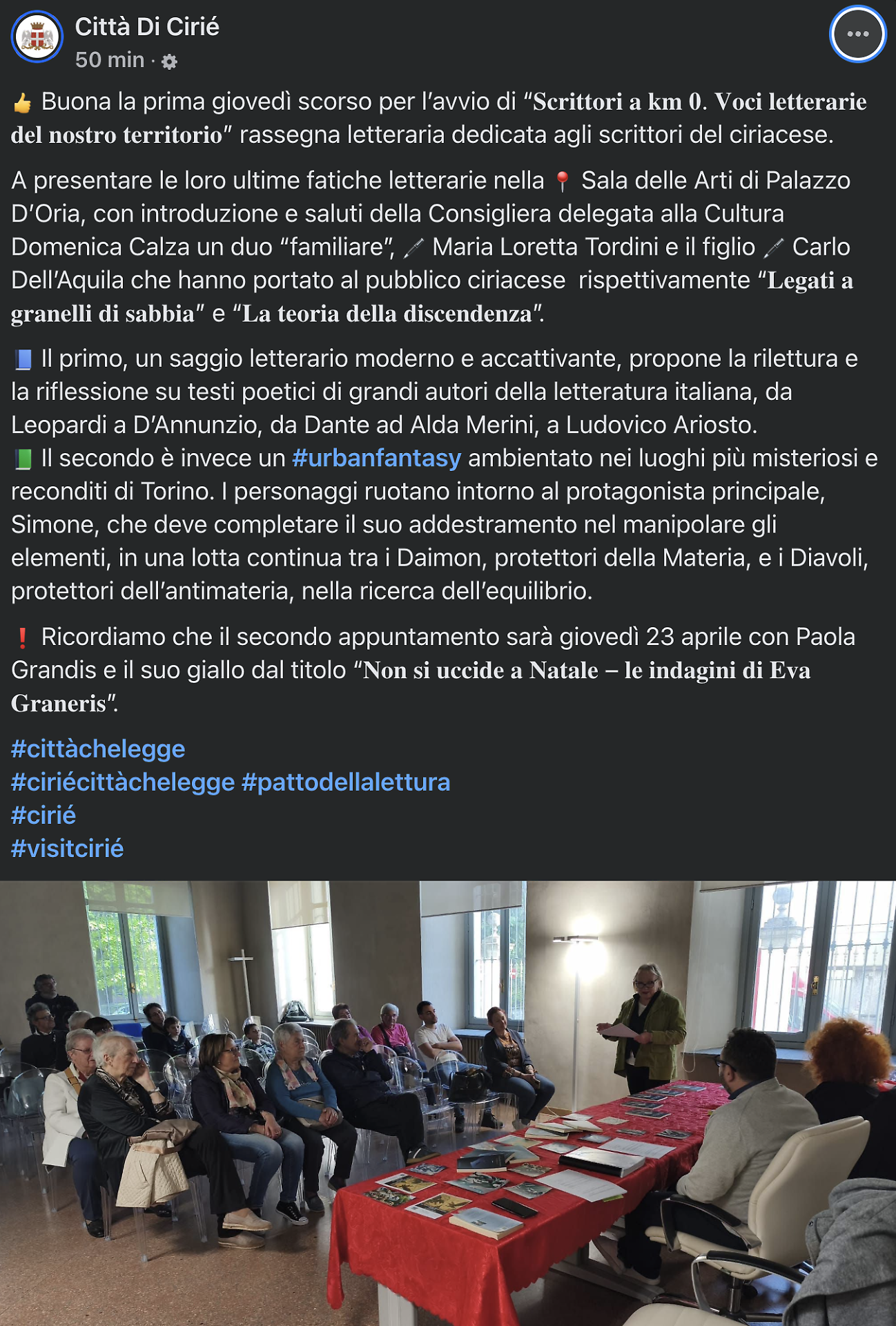Buona la prima per una rassegna che mette al centro il territorio e le sue voci. A Ciriè ha preso il via “Scrittori a km 0. Voci letterarie del nostro territorio”, un progetto culturale che punta a dare spazio agli autori locali, creando un dialogo diretto tra scrittura e comunità. L’esordio, giovedì scorso nella Sala delle Arti di Palazzo D’Oria, ha registrato un riscontro positivo di pubblico, confermando l’interesse per una proposta che intreccia identità, cultura e partecipazione.
