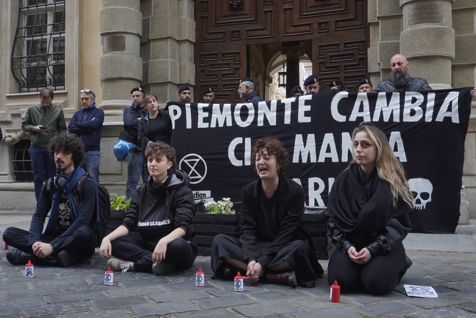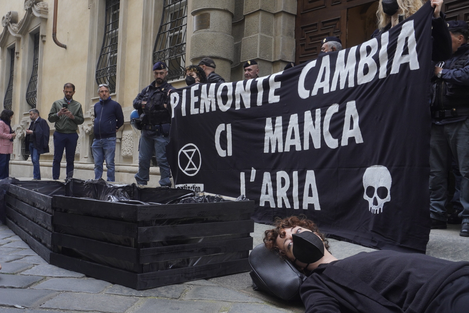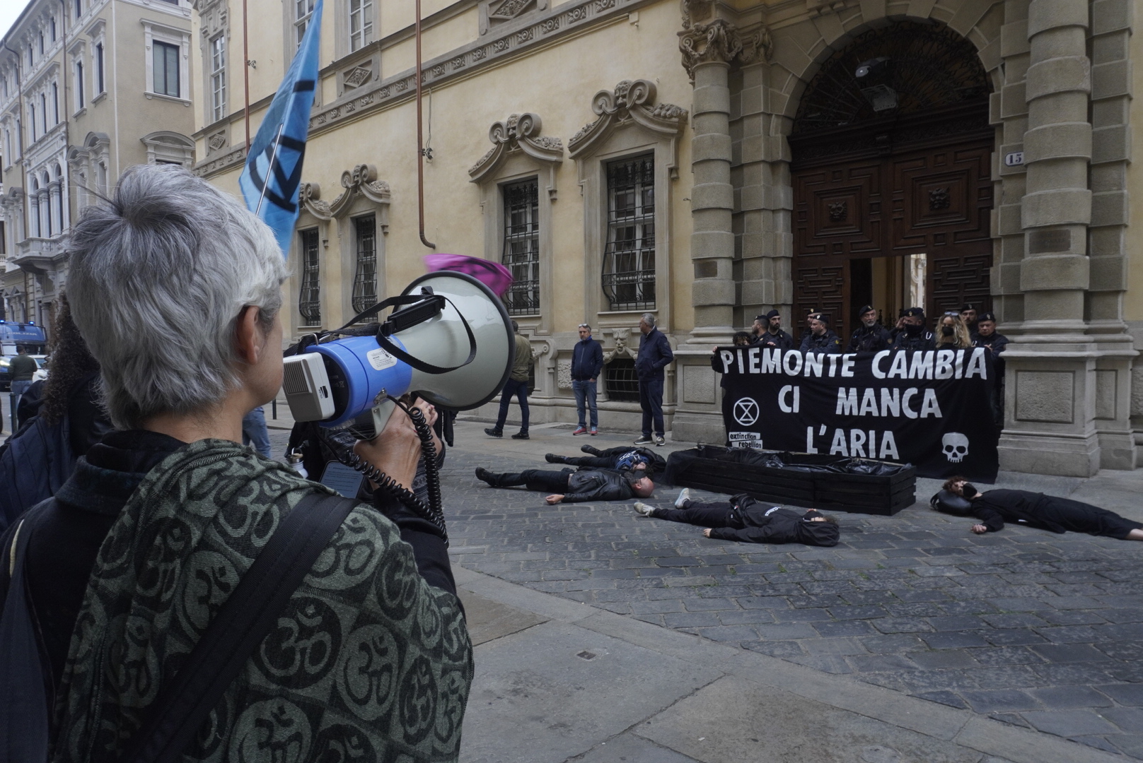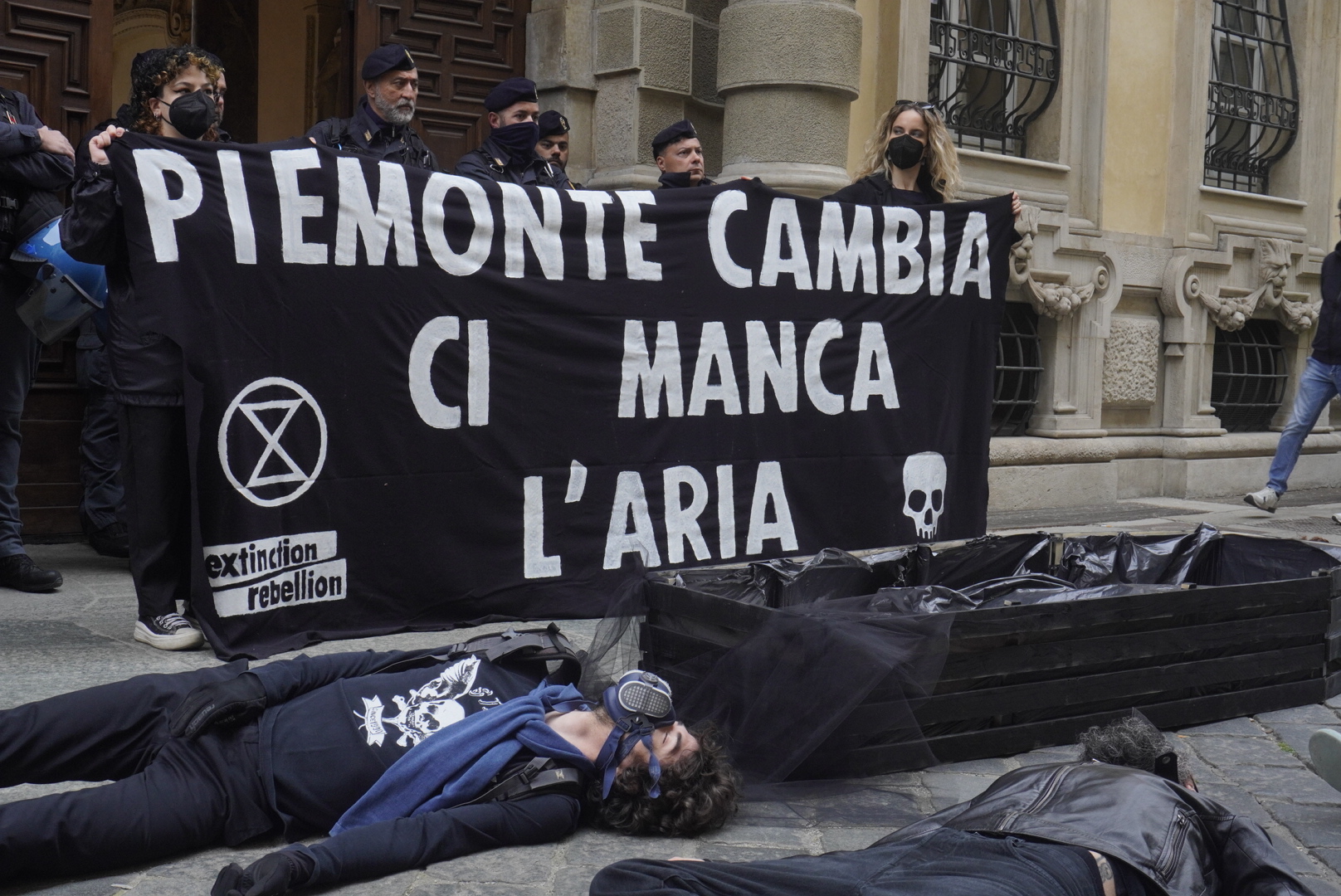 Una bara al centro della scena, piantine come simbolo di vita spezzata e un messaggio diretto alla politica: “Piemonte cambia, ci manca l’aria”. È con questa immagine forte e volutamente provocatoria che gli attivisti di Extinction Rebellion si sono presentati questa mattina davanti a Palazzo Lascaris, sede del Consiglio regionale del Piemonte, mentre era in corso l’assemblea.