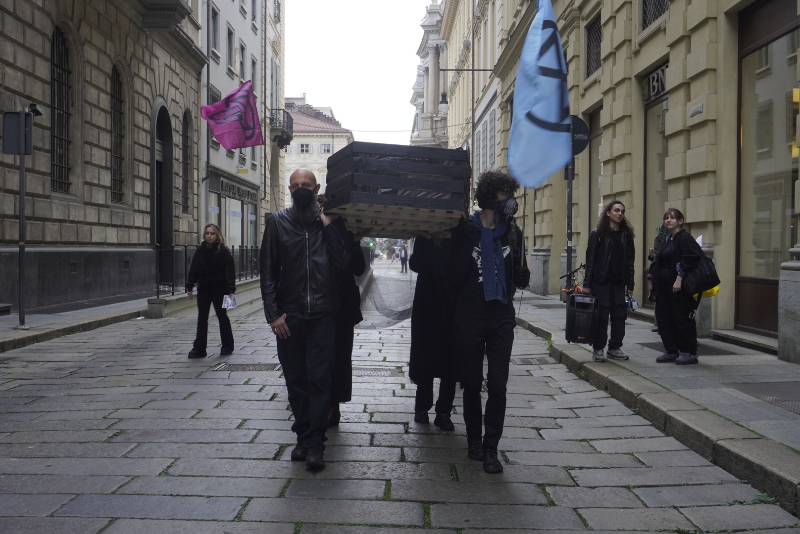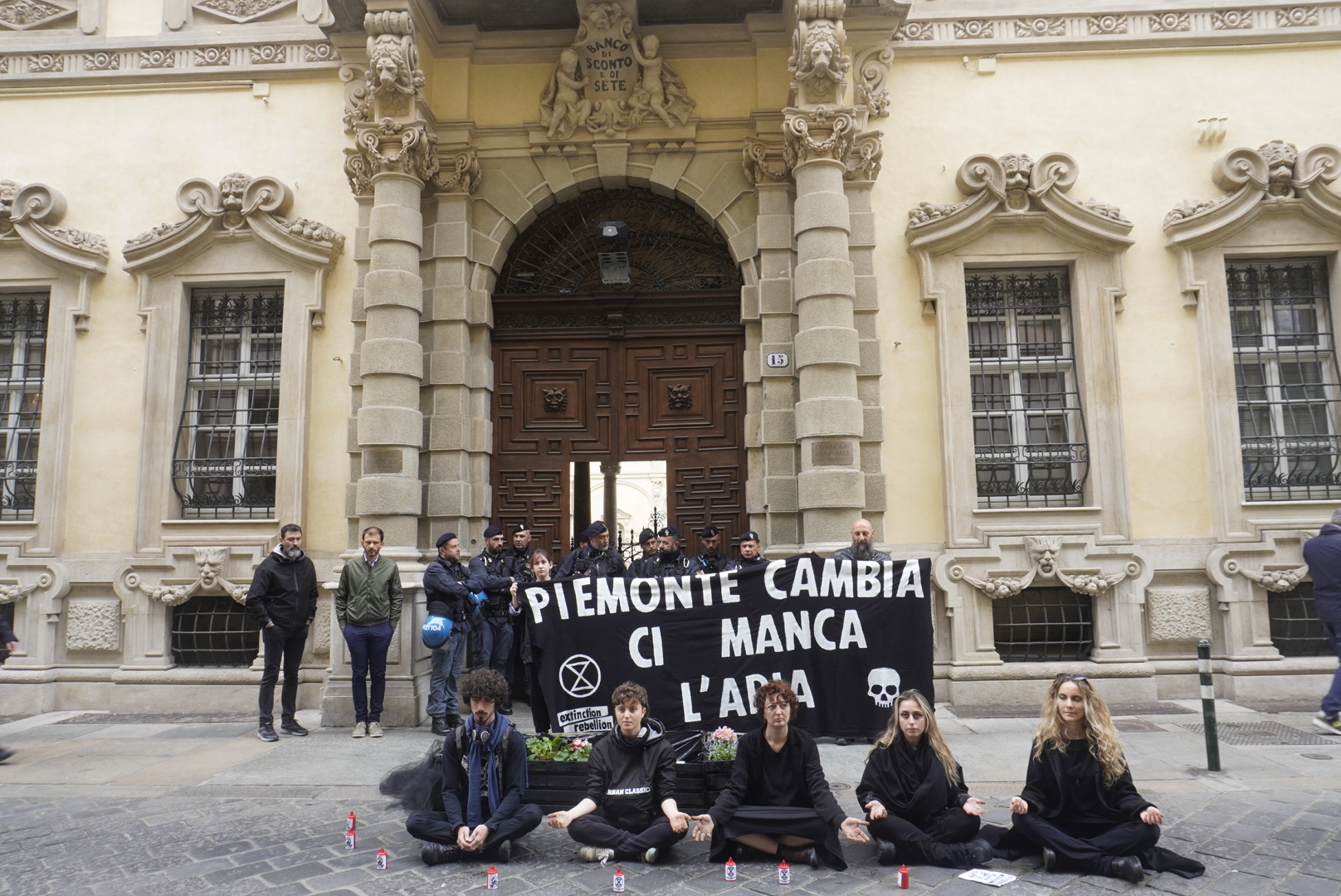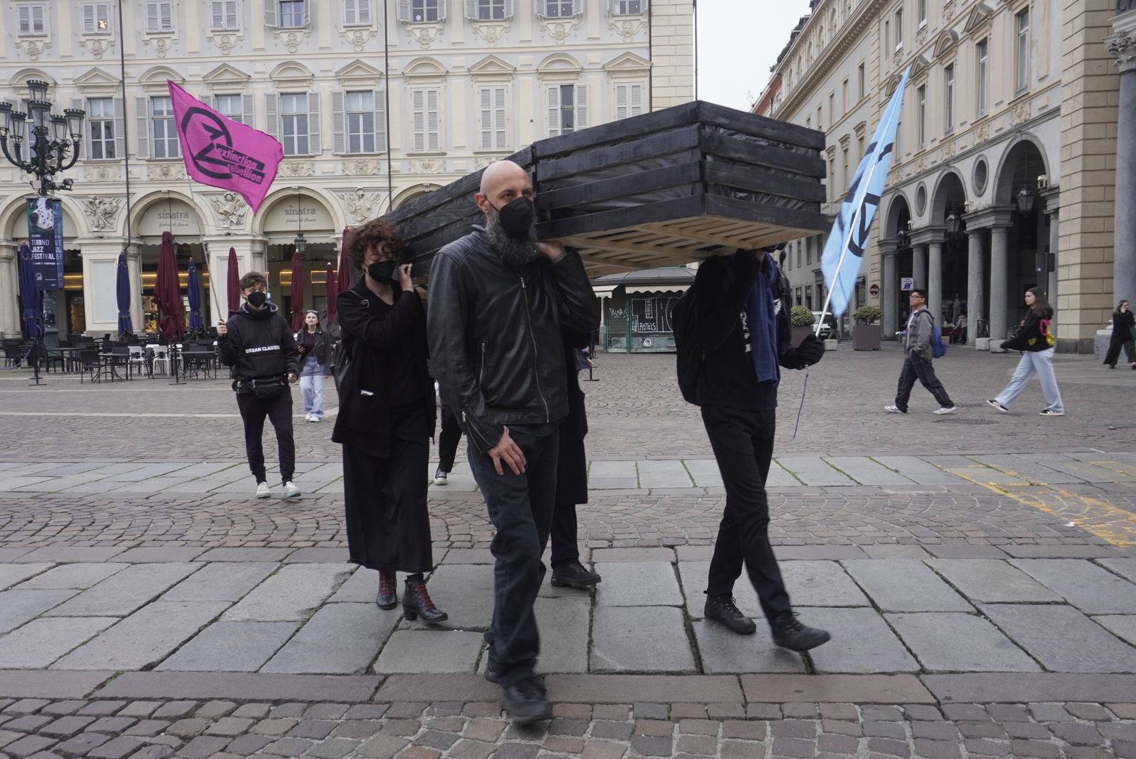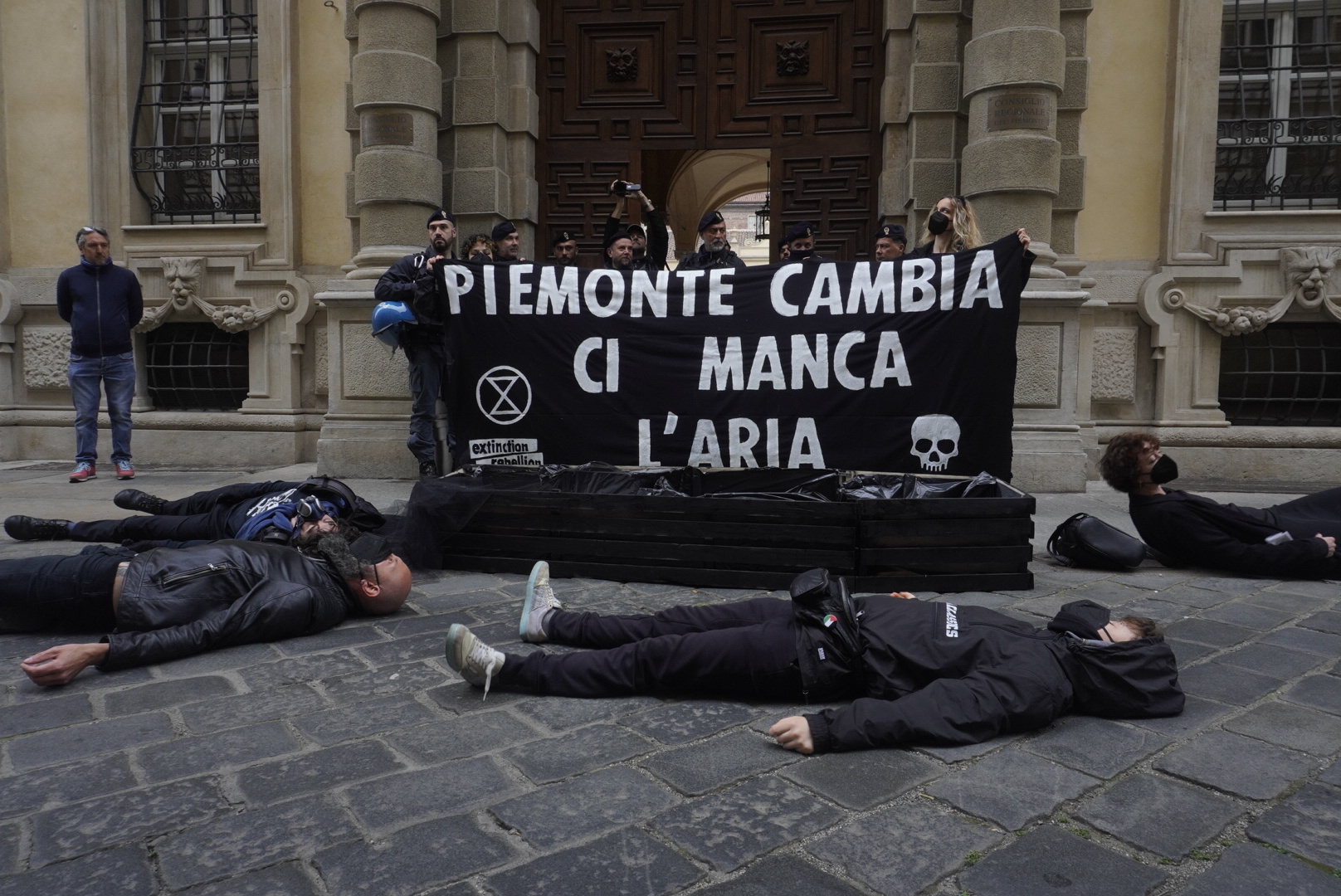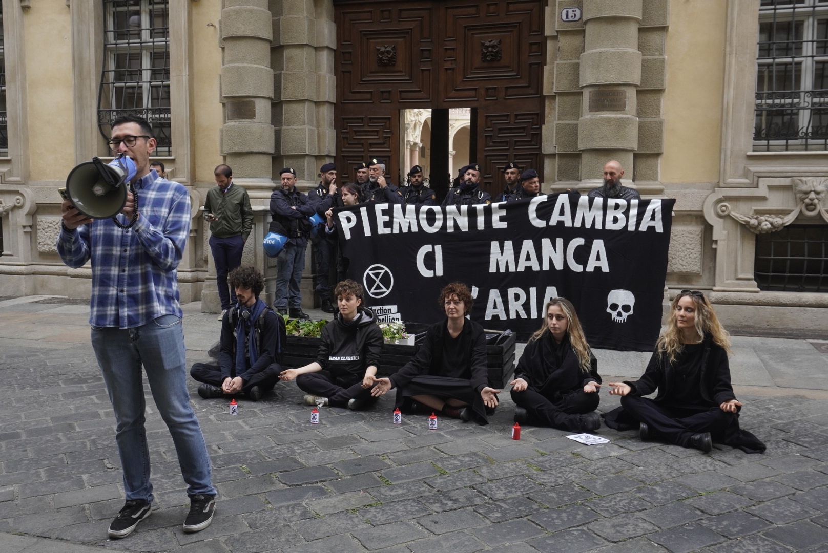 Una bara al centro della scena, piantine come simbolo di vita spezzata e un messaggio diretto alla politica: “Piemonte cambia, ci manca l’aria”. È con questa immagine forte e volutamente provocatoria che gli attivisti di Extinction Rebellion si sono presentati questa mattina davanti a Palazzo Lascaris, sede del Consiglio regionale del Piemonte, mentre era in corso l’assemblea.