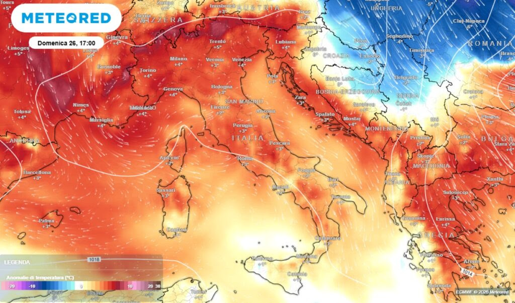 Le anomalie termiche previste sull'Italia domenica 26 aprile (mappa ECMWF tratta da Meteored Italia)