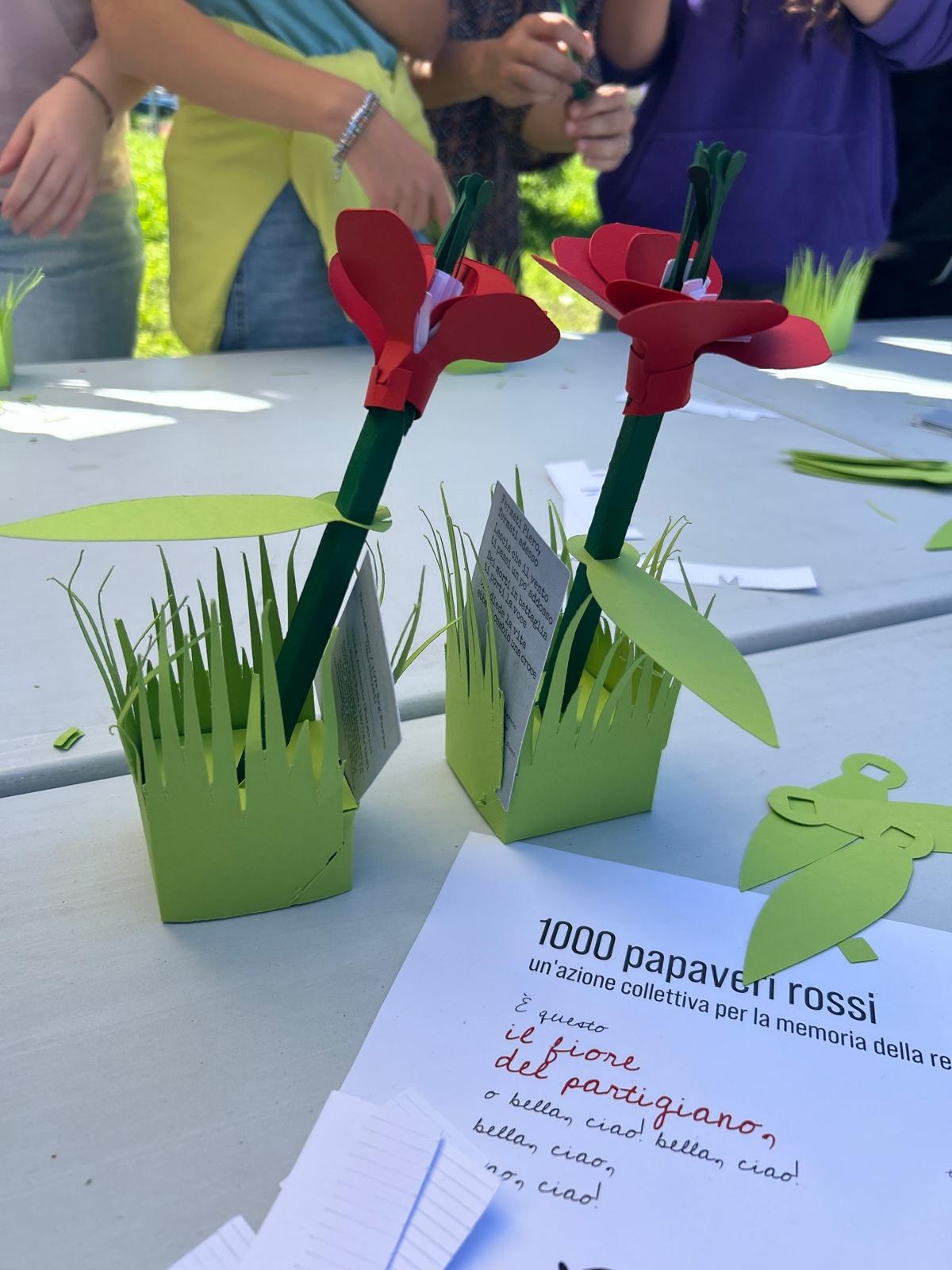 Al parco Pragranda, il 24 aprile, le ragazze e i ragazzi della Dalla Chiesa e della Silvio Pellico hanno dato vita a un grande prato simbolico, dove ogni papavero è dedicato a un partigiano o a una persona che ha contribuito alla Resistenza. Dentro ogni fiore, una storia breve, essenziale, ma sufficiente a restituire un volto e un frammento di vita.