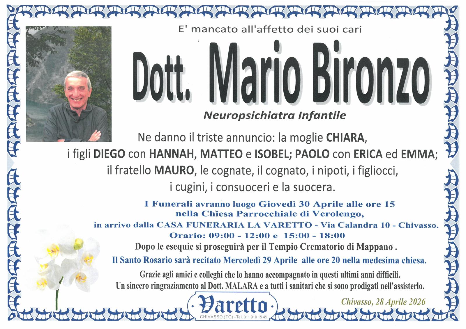 Aveva iniziato la sua carriera a Cavagnolo, come pediatra, distinguendosi fin da subito per una qualità che non si insegna: la capacità di entrare in relazione con le persone senza perdere il rigore del medico. Poi Verolengo, la sua terra, dove quel rapporto si è consolidato negli anni, diventando qualcosa di più di un semplice lavoro. Anche dopo il trasferimento a Chivasso, quel legame non si era mai interrotto. Bironzo era medico pediatra e neuropsichiatra infantile.