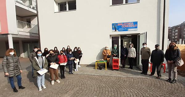 Tutti riuniti fuori dalla biblioteca di Banchette per premiare il segnalibro migliore