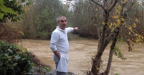 Il proprietario del ristorante Lido Malone indica la piena del torrente