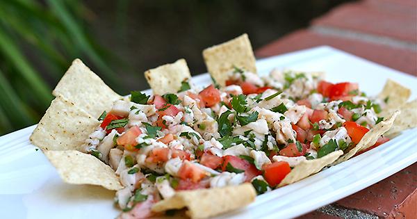 La "Ceviche" è un piatto abbastanza speziato, tipico sudamericano, a base di carpaccio di pesce crudo, marinato nel succo di agrumi. Qui il pesce è sostituito con verdure, profumate secondo la ricetta tradizionale e servite alternate a croccanti tortillas di mais (le tortillas di mais, alimento simbolo della cucina messicana, sono delle sottili sfoglie di farina di mais bianco, che vengono usate alla stessa stregua del pane, per avvolgere o semplicemente accompagnare degli altri cibi) per un antipasto molto speciale e adatto alla stagione attuale.