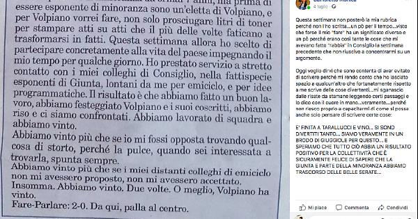 “Questa settimana non posterò la mia rubrica perché non l’ho scritta – ha postato su Facebook -. Erano così tante le cose che mi avevano fatto “rabbia” in Consiglio la settimana precedente che non riuscivo a concentrarmi su un argomento. Oggi voglio dirvi che sono contenta di aver evitato di scrivere perché mi rendo conto che ho lasciato spazio a qualcun’altro che fortunatamente rispetto a me scrive delle cose divertenti. Mi sganascio dalle risate da stamane leggendo certi passaggi e lo dico con il cuore in mano, veramente, perché non riesco proprio a capacitarmi di come si possa anche solo pensare di scrivere certe cose: è finita a tarallucci e vino, si sono divertiti tanto. Siamo veramente in un brodo di giuggiole per questo e speriamo che tutto ciò abbia un risultato positivo per la collettività che è sicuramente felice di sapere che la giunta e parte della minoranza abbiano trascorso delle belle serate…”.