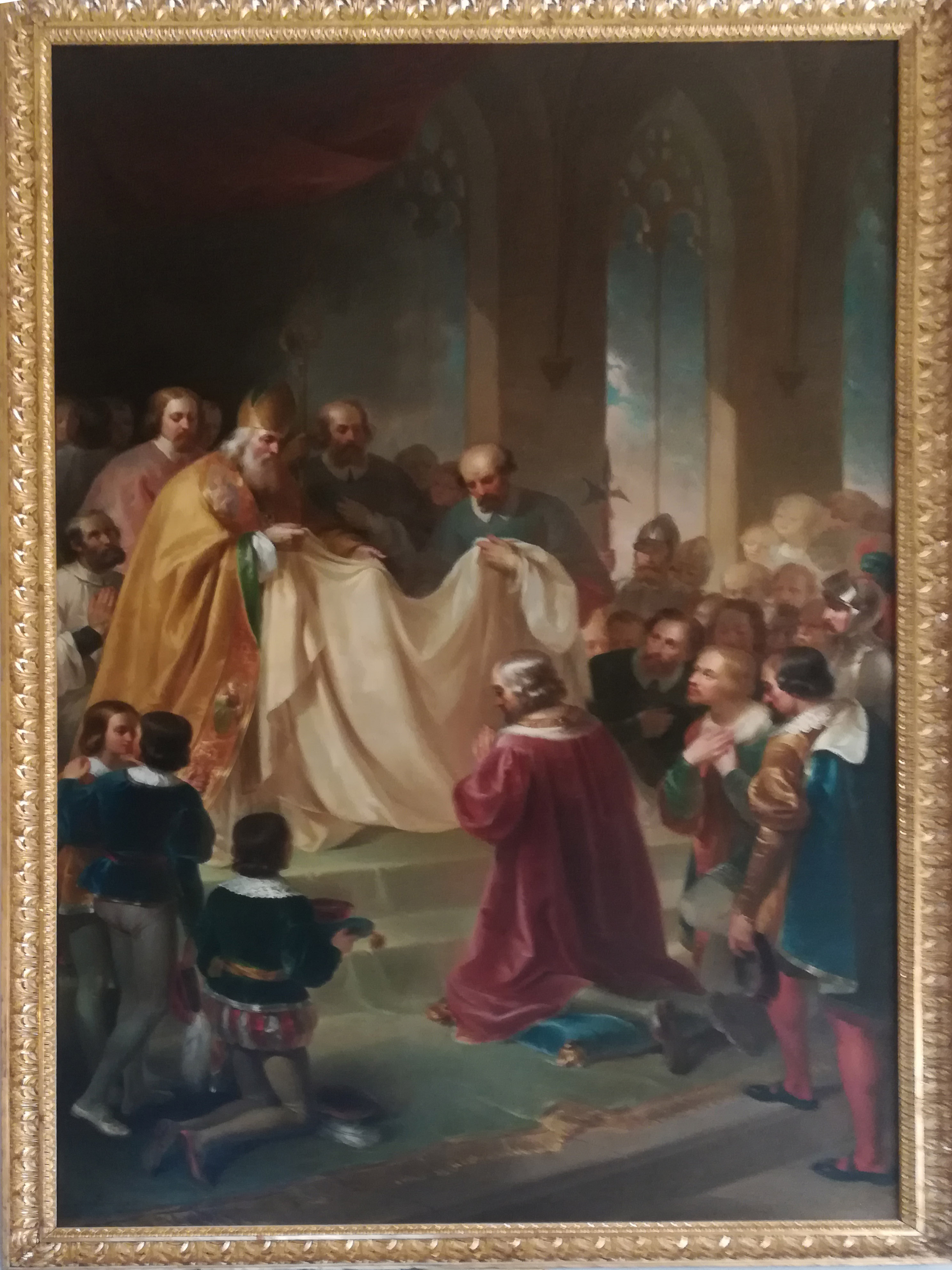 La reliquia Sindone, importantissima per l’immagine dei Savoia sin dal 1453 (anno di acquisizione), è sempre stata sapientemente utilizzata dai Savoia per ricordare la gloria della dinastia. Alla Galleria Sabauda di Torino è esposto un dipinto significativo e restaurato, proprio in previsione della riapertura della Cappella della Sindane. Si tratta di un dipinto di Giovanni Marghinotti (Sarzana 1802, La Spezia 1869) che immortala il Duca Carlo III (presente anche nell’affresco di Voragno) in atto di venerare la Sindone al castello di Chambery. L’opera, il cui restauro ha permesso di mettere in evidenza anche i sottilissimi tratti con cui il pittore aveva raffigurato sul Lenzuolo il volto ed il corpo di Cristo, fu commissionata da Re Carlo Alberto nel 1844 nell’ambito del programma di celebrazione della dinastia sabauda. In quell’occasione, Carlo Alberto commissionò anche un’altra opera in cui il Beato Amedeo IX (erede della Sindone) fa l’elemosina ai poveri (1842). La scena è ambientata a Chambery e l’opera è di Camillo Pucci (Cagliari 1798 - 1865) che rappresenta il Beato Amedeo IX ed alcuni membri della famiglia reale nell’atto di dispensare l’elemosina ai sudditi riconoscenti. Anche in questo caso la raffigurazione riporta un preciso messaggio: il Re che dispensa l’elemosina è santo e garante della pace. Entrambe le opere, di notevoli dimensioni e facenti parte della collezione dei Musei del Palazzo Reale, destinate ad essere collocate ai lati del portale di accesso alla Cappella della Sindone. Il restauro è stato presentato nel corso di una serata a Palazzo Reale ad inizio anno, da Enrica Pagella, Direttrice dei Musei Reali ed oggi concluso con la restituzione al pubblico delle due opere. I quadri erano notevolmente danneggiati a causa di perdita di tensionamento della tela, infiltrazioni di umidità, presenza di sostanze carboniose e colature della vecchia vernice protettiva. Ad ognuno di questi danni si è provveduto con specifiche tecniche (applicazione di adesivi, riadesione, termocauterizzazione, pulitura selettiva, reintegrazione materi, ecc.) sino ad ottenere il restauro completo ma senza interpretazioni non filologicamente corrette.