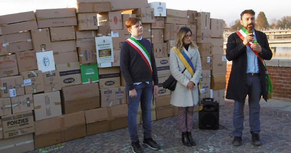 Un muro di scatole di cartone (offerte dai supermercati Borello e Mercatò) è stato posizionato a metà del Ponte Vecchio, dividendo simbolicamente l’Oltrepo dal Centro città.