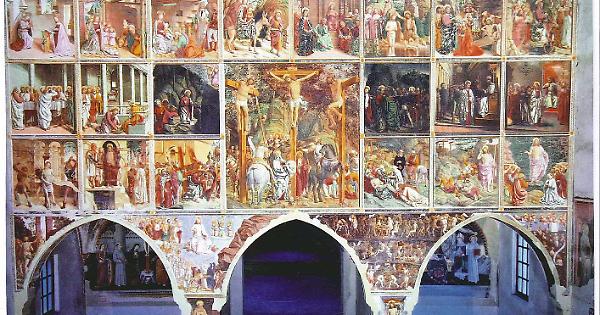 Eccoci purtroppo giunti alla descrizione dei bellissimi affreschi della Chiesa di San Bernardino. Vi chiederete il perché del rammarico. Semplice: perché qui finisce la possibilità di cavare sangue dalle rape, anche se di rape in realtà non si tratta, bensì verdure di pregio. Insomma, con questo intervento finisco di parlare di questo grazioso gioiellino eporediese, e non me ne do pace. Allora, di Martino Spanzotti vi avevo già detto vita morte e miracoli (tranne di quella volta che riuscì miracolosamente convincere Anna Malo che stava piovendo, ed effettivamente stava proprio piovendo), quindi dirigiamoci senza indugi verso quelle opere d'arte. Va da sè che ci occuperemo esclusivamente degli affreschi dipinti sul tramezzo della chiesa, che sono quelli di produzione spanzottiana. Gli altri li lasciamo perdere perché Sgarbi ha detto che fanno cacare. Naturalmente scherzo, se davvero Sgarbi avesse detto questo, mi dedicherei a loro per i primi. Quello del tramezzo è un complesso assai voluminoso, in cui vengono rappresentate le fasi salienti della vita di Gesù, ad eccezione degli incontri di boxe e le partite a scala quaranta. Sono presenti venti scene di vita tratte dai Vangeli, ovvero quello Marco, Matteo, Luca e, mi pare, Ciampolillo. Al centro, su una superficie quadrupla alle venti altre scene, vi è la Crocifissione, così, per dare quel tocco di allegria a tutto l'insieme. Sulle due colonne portanti abbiamo Un Cristo morente, e San Bernardino, anche se potrebbe trattarsi, invece, del sindaco Sertoli col Poncho. Il ciclo della vita di Gesù inizia con l'Annunciazione, anche se Troisi non c'è. Nella Natività spicca la presenza di tale Georgia Popolo, che cerca di intrattenere il Bambinello mostrandogli un Presepe. Il pargolo tenta di spiegarle che trattasi di metapresepe, ma il tentativo di dimostra subito disperato. Quindi abbiamo l'Adorazone dei Re Magi, che recano con sé oro, incenso, e Gigno Vinia. Nella quarta scena vediamo la Fuga in Egitto di Giuseppe, Maria, Gesù e Salvini. Non poteva mancare la disputa tra i Dottori, che non sanno che pesci pigliare contro l'epidemia di Covid 19 a.C. Poi viene il Battesimo, che glielo fanno a trent'anni perché si erano dimenticati. Ma cacchio, ce ne sono ancora quattordici!!! Senza contare che i personaggi che ci ficco di solito ce li ho già piazzati tutti, anzi, addirittuta ci ho aggiunto Sertoli! Sì, è vero, Manca Balzola, ma di sdruccioli ho già messo Sertoli. No vabbè, a questo punto faccio che cavare sangue dalle rape ancora una volta, la prossima. Adesso vi saluto e vado a vedere le opere dello Spanzotti sul paginone centrale di Play Boy.