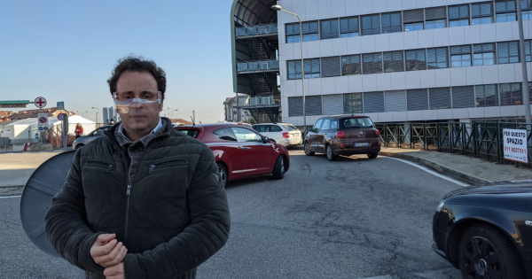 Matteo Doria alla rotonda di fronte all'ingresso dell'ospedale