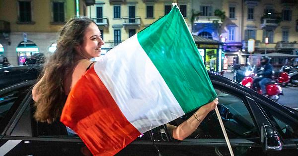 SEMIFINALE EUROPEI DI CALCIO 2020, L'ITALIA BATTE LA SPAGNA. LA PARTITA SEGUITA A MILANO FESTEGGIAMENTI TIFOSI BANDIERA TRICOLORE ITALIANA BANDIERE TRICOLORI ITALIANE