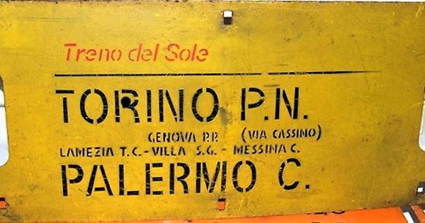 Cartello ferroviario per il Treno del sole in partenza da Torino