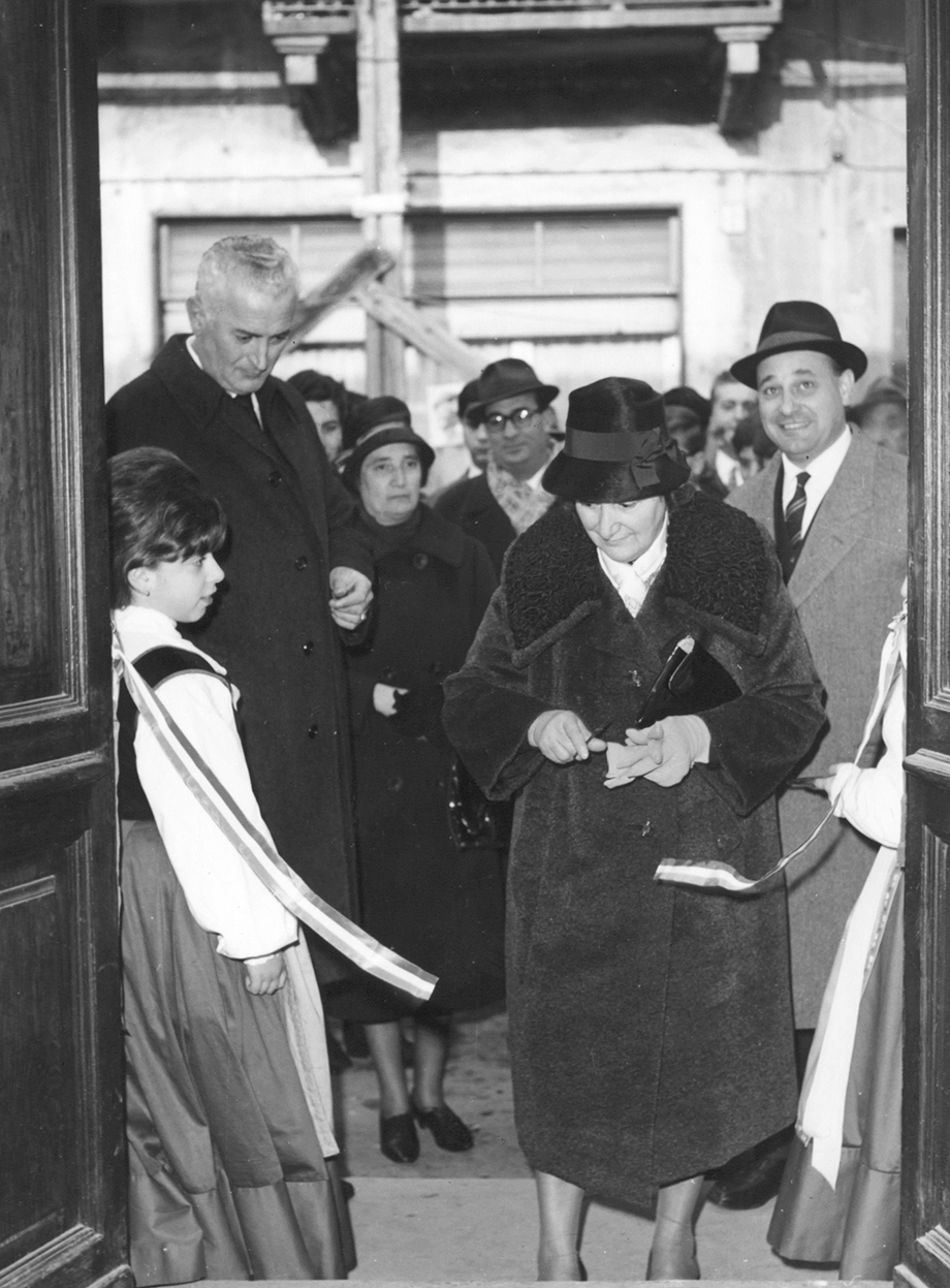 Taglio del nastro della biblioteca civica nei locali del forno pubblico di via Mazzini. A sinistra il maestro Antonio Fornello, il primo direttore della biblioteca