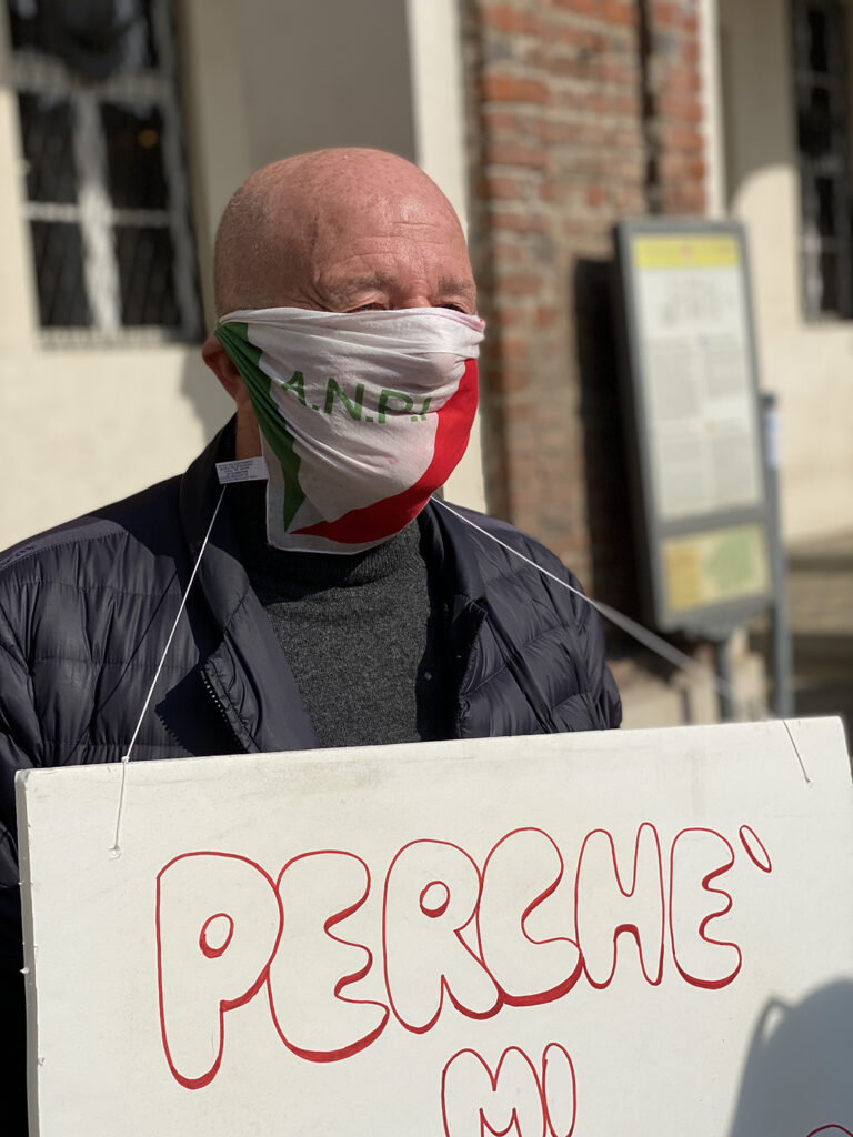 Con il volto “imbavagliato” nel foulard dell’Anpi e un cartello appeso al collo, questa mattina intorno all’ora di pranzo, mentre in sala consiliare si svolgeva il congresso del Partito Democratico, l’ex sindaco Libero "Lino" Ciuffreda ha portato la sua protesta di fronte a Palazzo Santa Chiara.