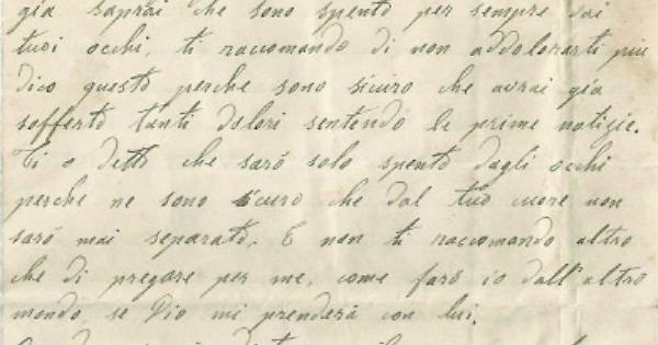 Mia adorata moglie e bimbi Se riceverete questa lettera in mia presenza beveremo una bottiglia alla salute, e se la riceverete in salute e sempre in presenza mia pregheremo assieme e di cuore il buon Dio che ci a fatto questa grazia. Se per disgrazia riceverai questa lettera e già saprai che sono spento per sempre dai tuoi occhi, ti raccomando di non addolorarti più dico questo perche sono sicuro che avrai già sofferto tanti dolori sentendo le prime notizie. Ti o detto che sarò spento soltanto dagli occhi perche ne sono sicuro che dal tuo cuore non sarò mai separato. E non ti raccomando altro che di pregare per me, come farò io dall’altro mondo, se Dio mi prenderà con lui. Quando giacerò disteso e il mio sangue bagnerà le terre redenti conquistate col sacrificio della mia vita e di tanti miei compagni, se avrò il minimo respiro il primo e ultimo pensiero sarà di mandarti un ultimo saluto a te e ai cari bimbi da lontano dagli occhi ma mai dal cuore. Se per caso troverai una nuova compania non ti voglio impedire, ma però ti devi ricordare dei nostri che e l’unico frutto del nostro sangue che Dio ci a dato in questo mondo, perciò vorrei raccomandarti che questa tua nuova compania portasse il massimo rispetto ai miei figli che sono così cari per me. In secondo luogo ti consiglio a tornare in piemonte vicino ai parenti, la almeno troverai una qualche una parola di conforto da qualcheduno. Ricorderai sovente ai cari bimbi il loro caro padre, e gli insegnerai a vivere onestamente e all’onor del mondo come a vissuto suo padre fino all’ultimo giorno di vita. Prima di entrare in pericolo gia avrò cercati di spedirti a casa quei pochi dinari che tenevo in tasca perche non cadano in mano ad altri. Farai legger questa lettera a chi non fosse ancora persuaso della mia scomparsa. E se questo sarà stato il mio destino ne sarò morto contento per una cosa sola che sono sicuro che nessuno potrà dire che io o lasciato da dare qualche cosa. Il mio maggior dolore essere mancato e prima di tutto al tuo amore, e poi per averti lasciato i figli in tenera età incapaci di guadagnarsi il pane, come ti ripeto il mio dolore e per voi tutti, per me mi rassegno alla volontà di Dio purche mi prenda in una buona ora. Mi perdonerai se ti o offeso nel tempo che abbiamo vissuto insieme, mi perdoneri se o offeso i tuoi parenti, mi perdonerai se ai sofferto per causa mia, infine domanderai perdono per me ai tuoi e ai miei parenti, di tutte le volte che li o offesi. Miei adorati Sandro e Rina.Se sentirete a leggere questa lettera dalla vostra madre e vi dirà tutta lacrimante che io sono caduto sul campo di battaglia ricordatevi che e vostro padre che la scritta e vi raccomando di essere sempre buoni e ubbidienti e rispettosi alla vostra mamma come avete fatto mentre era in vita il vostro padre e vi raccomando di pregare per me, di non andare coi cattivi compagni e di ascoltare i buoni consigli della vostra cara mamma. Se avrete la fortuna di venire grandi, imparate a vivere da onesti, appena che potrete aiutate la vostra mamma nelle faccende di casa, e quando imparerete una professione cercate di farne frutto e trarne profitto, e finalmente non abbandonate mai la vostra cara mamma per tutto il tempo della vita. Se qualcheduno ti domanderà conto di me dirai che io o perdonato a tutti come spero che tutti perdoneranno me. Quando riceverai questa lettera senza la mia presenza, la bacerai di cuore perche é l’ultimo schritto e sono le ultime parole fatte di pugno di tuo marito, che sempre ti a amata col più puro degli amori che sia su questa terra, e se Dio lo permette ti amerà ancora nella vita eterna. Questo mio schritto se lo leggerai senza la mia presenza sono sicuro che sarà il più grande dolore che possa soffrire una moglie che ama suo marito, ma come ti ripeto di non addolorarti più non farti cattivo sangue, che tutto è inutile, il meglio è di pregare Dio e la Vergine SS. Che sono loro l’unico conforto dei Congiunti O pensato di fare questa lettera perche la conservi come conservare un gioiello più prezioso che abbi in questo mondo, così ti servirà quando sentirai il bisogno di sfogarti il dolore, di parlare con me, insomma in qualunque sfogo che tu abbia leggerai questa lettera, mi pare a me che ti sembrerà di parlare con me e così passare i tuoi pensieri, e se ti pare che ti addolora troppo appena l’avrai letta la brucerai. Per memoria e testamento non ti posso dire nulla perché già sai che al sole non o nulla, poi è inutile parlarne quello che ce è tuo, come sarà tuo l’amore che avrò in cuore verso di te quando giacerò sotto terra e in terra straniera. Però ti domando solo una cosa ed è che quando sarai sicura che sarò spento eternamente alla luce farai recitare due messe per la mia povera anima, e le farai recitare al Santo con cui porto il suo nome, che è sempre stato il mio protettore, ed è da quel Santo l’o pregato e mi a fatto la grazia di averti in mia compania te che non me lo sarei meritato un amore simile. Ne avrei un romanzo da schriverti ma mi limito a dirti le cose più necessario, perché a raccontarti tante cose ti reca troppo dolore. Pergiò ti mando un ultimo saluto, è l’ultima volta che ti mando un infinità di baci a te e ai cari bimbi, che mi erano tanto cari, saluterai per l’ultima volta tutti i tuoi, i miei parenti e amici, ancora una volta domando perdono a tutti, di qualunque offesa abbia io fatto ai parenti e amici, e coll’aiuto di Dio e Maria SS.ma spero che un tempo si troveremo uniti in cielo la vita eterna che si saremo meritato con nostro sacrificio e coll’aiuto di tutti i Santi, la almeno vivremo insieme per non mai più morire in vita eterna così sia. Di nuovo un ultimo addio dal tuo amato marito,e padre dei cari Angioletti Sandro e Rina, vostro e Defunto Antonio Ma o speranza che Dio e Maria SS.ma saranno tanto buoni da farci la grazia di poter leggerla insieme e allora faremo un regalo a qualche Santuario.